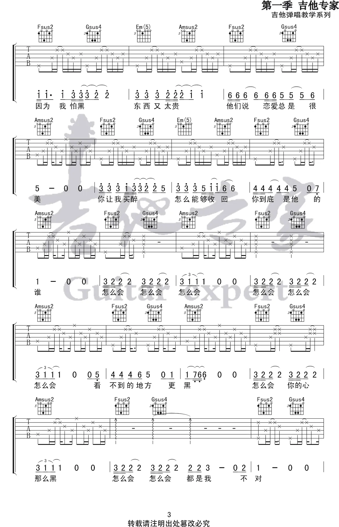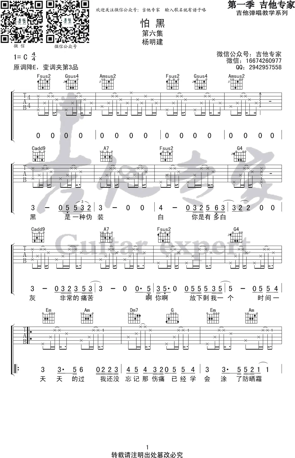 杨明建《怕黑》吉他谱,由杨明建作词作曲并演唱。歌曲原调降E,吉他谱选用C调指法编配,capo夹3品。共4张图片谱,由吉他专家制编配出品。