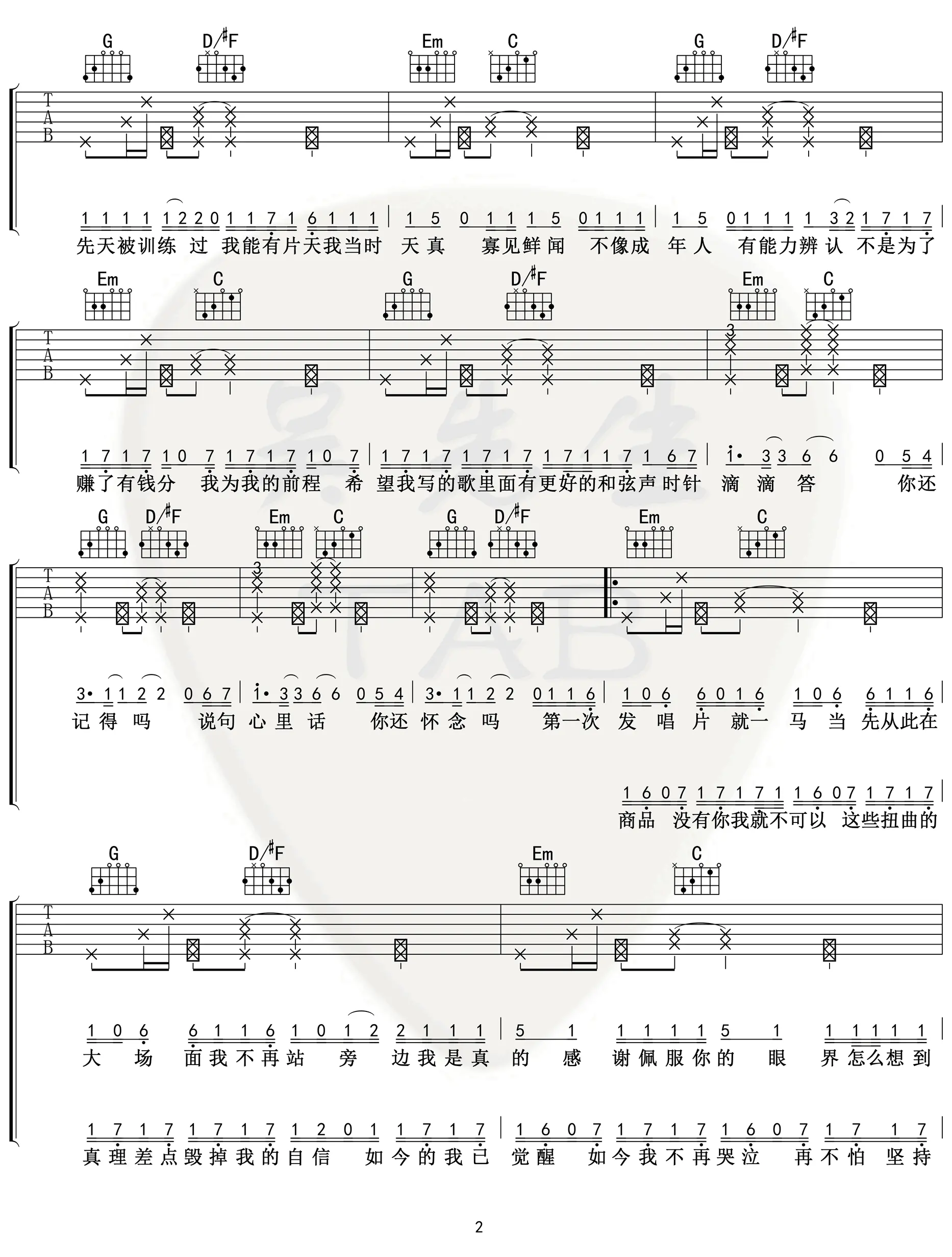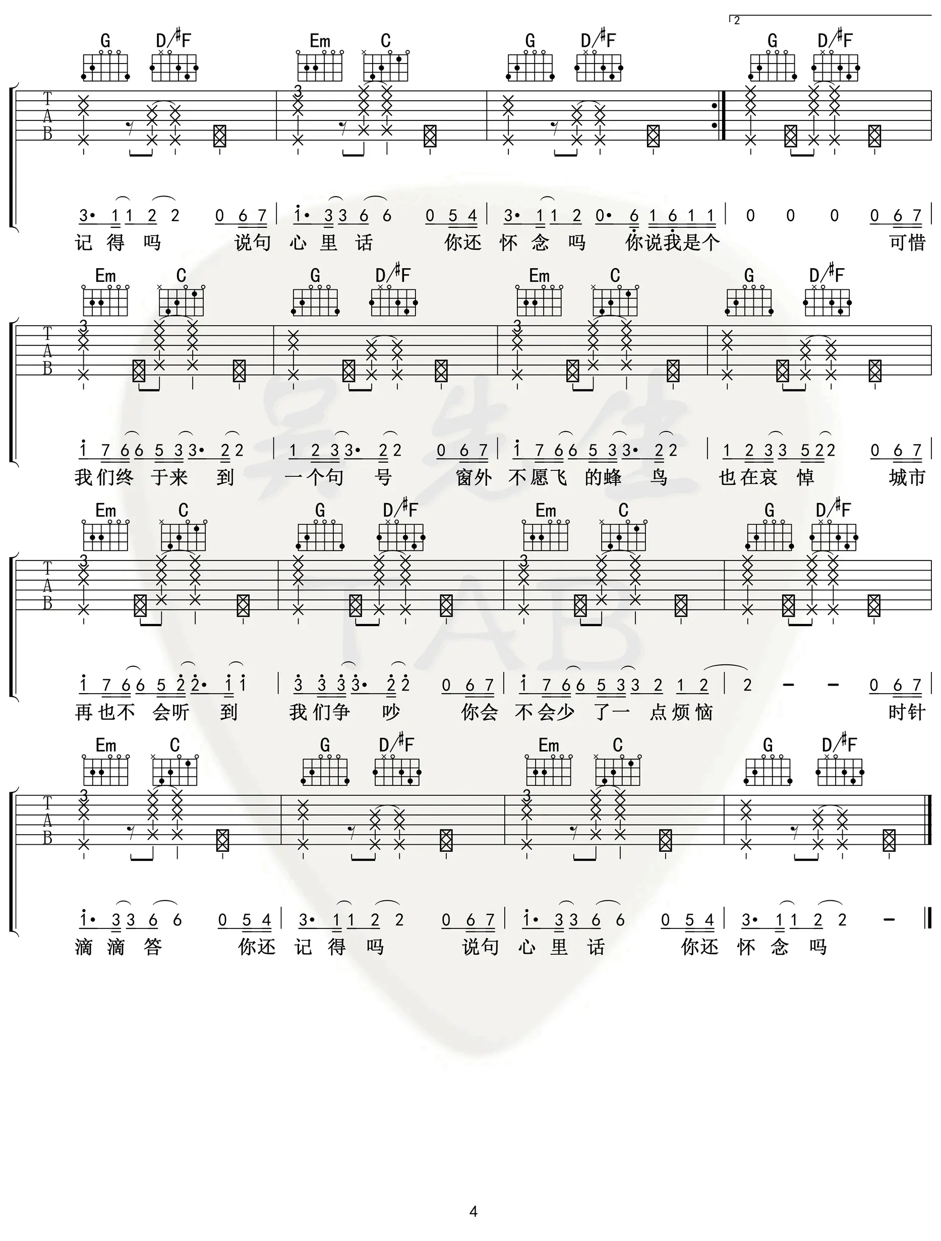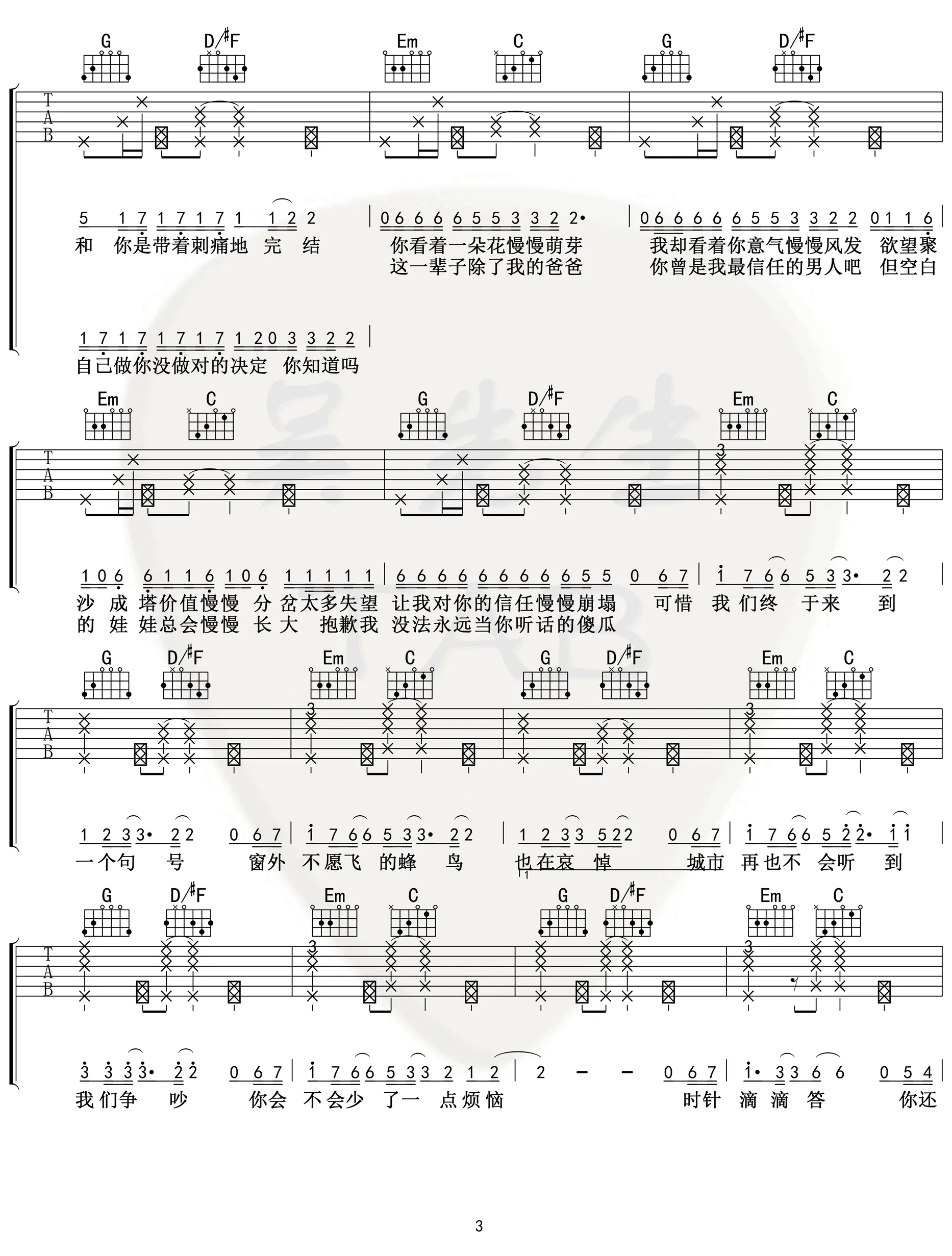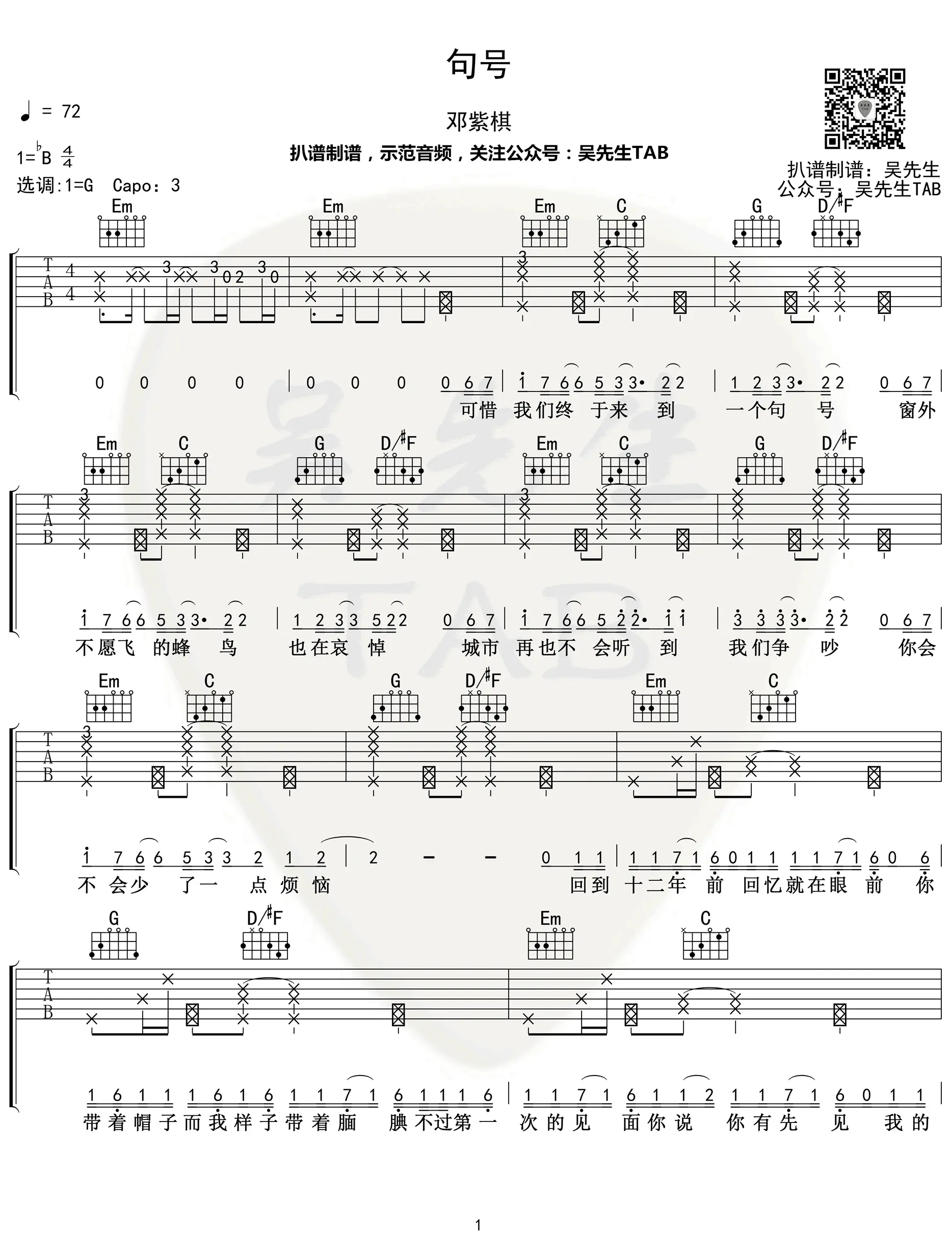 《句号》吉他谱,邓紫棋演唱,由邓紫棋作词、作曲并演唱,2019年发行,收录在专辑《摩天动物园》中。 歌曲原调降B,吉他谱选调G调,变调夹夹3品,共4张图片谱,由吴先生编配出品。