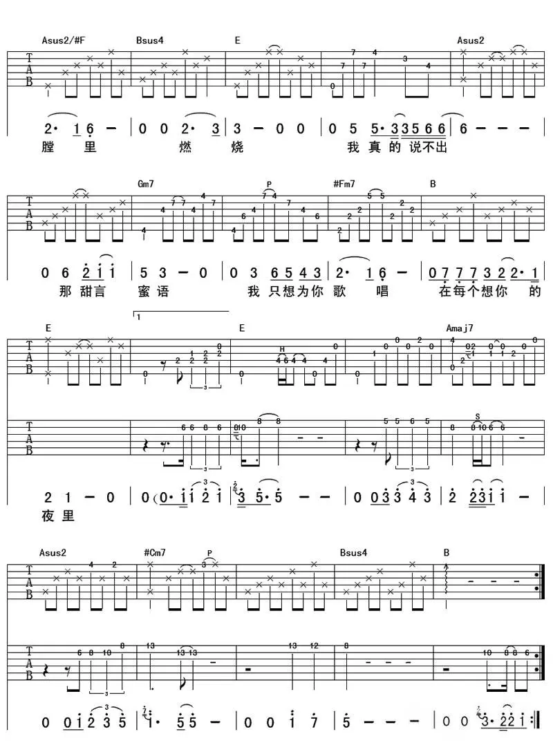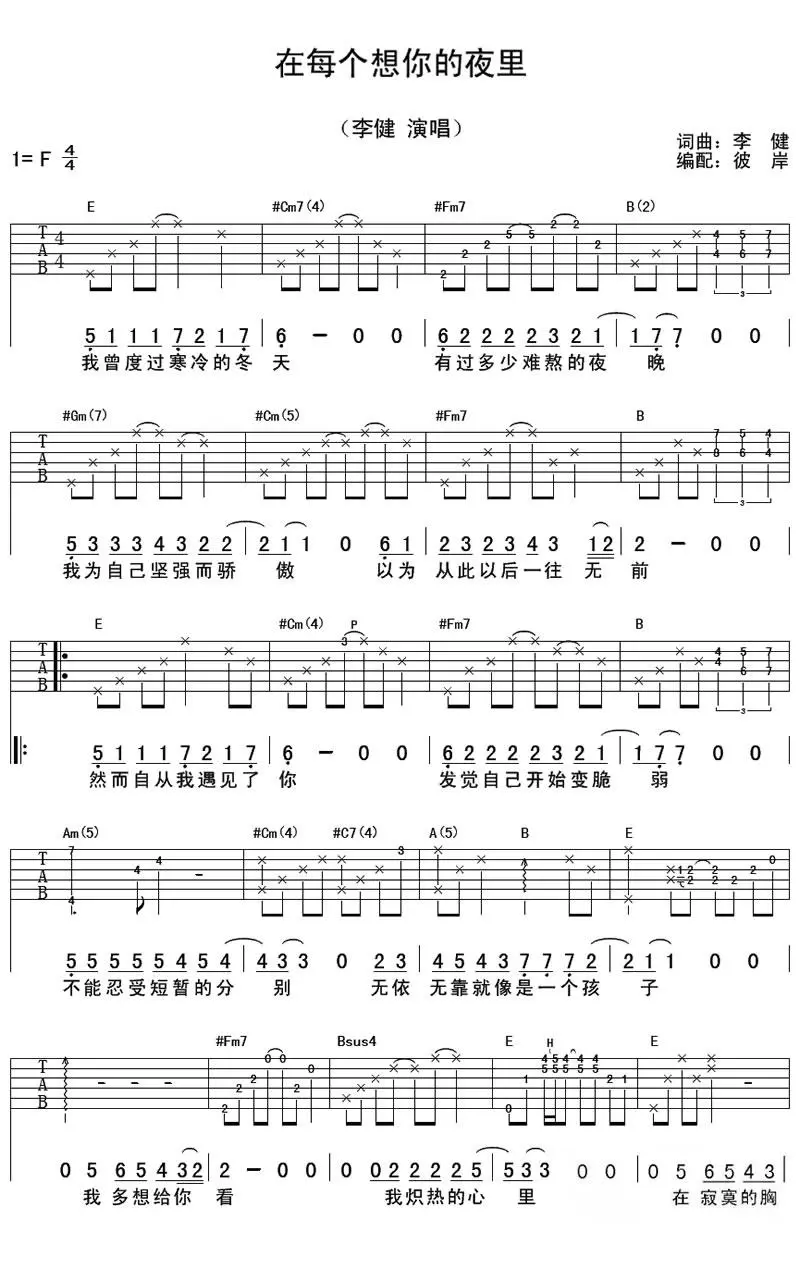 在每个想你的夜里吉他谱,李健创作及演唱的一首歌曲,由李健作词作曲,收录于2009年发行的专辑《音乐傲骨》中。吉他谱选调F调,共4张图片谱。