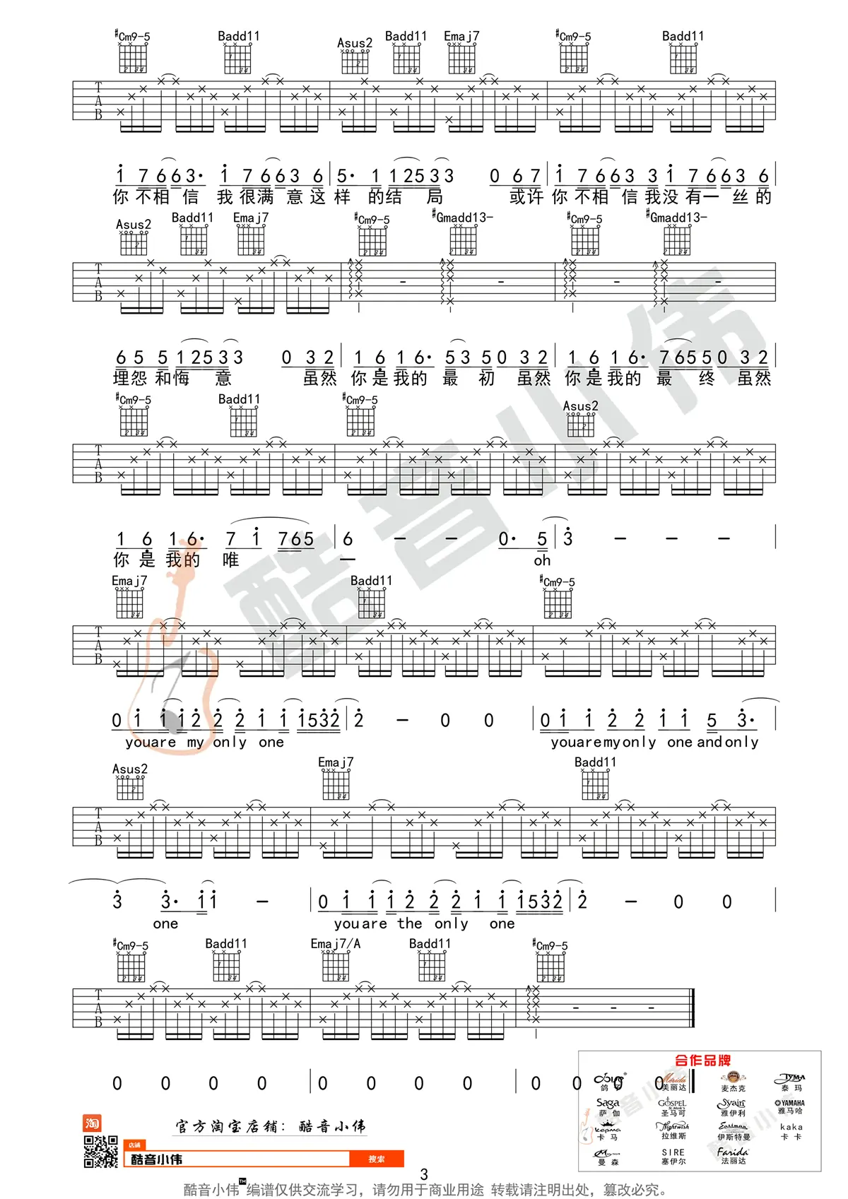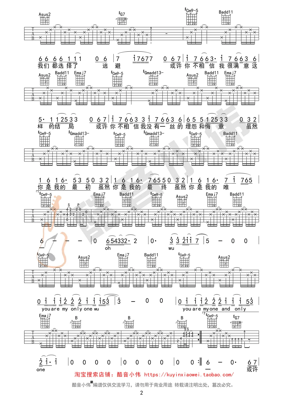林俊杰《你是我的唯一》吉他谱,原唱巫启贤,林俊杰翻唱,由邢增华作词,巫启贤作曲,2016年发行,现场版翻唱自《梦想的声音》第三期节目,收录于专辑《梦想的声音 第3期》中。歌曲原调#F,吉他谱选调E调,男声演奏推荐capo夹0-2品或降半音调弦,女声推荐capo夹2-4品,中级难度编配,由酷音小伟制谱出品。