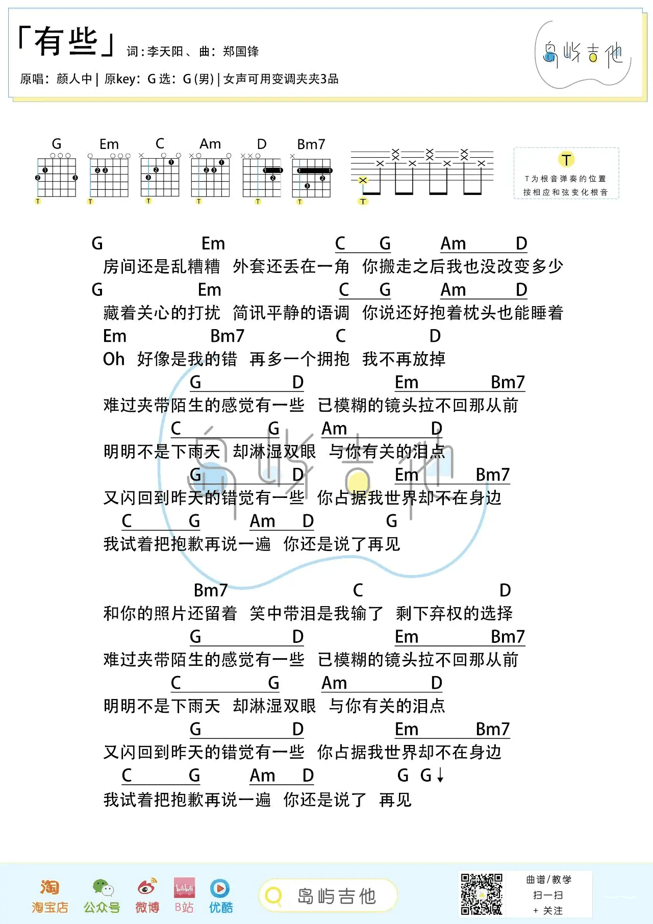 《有些》吉他谱,颜人中演唱,由李天阳作词,郑国锋作曲,2019年发行,收录于2019年发行的EP《失眠症候群》中。以吉他、钢琴交织的抒情编曲,混搭电子节奏的速度感。 歌曲原调G,吉他谱选用G调指法编配,女生可以capo夹3品,由桃子鱼仔编配出品。