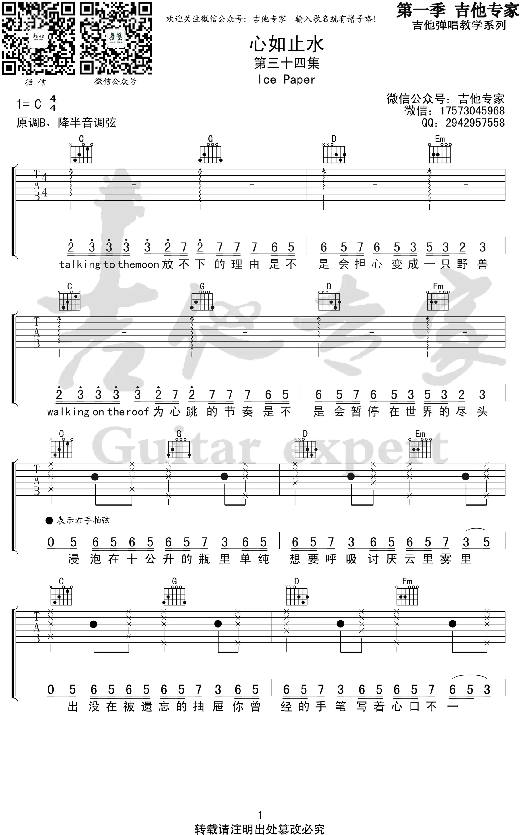《心如止水》吉他谱,Ice Paper作词、作曲及演唱的一首热门单曲,2019年发行,收录于专辑《成语接龙》中,编曲采用合成器伴奏并运用特殊和声(二级大三和弦营造离调感)。歌曲原调B,吉他谱选用C调指法编配,降半音调弦,由吉他专家编配出品。