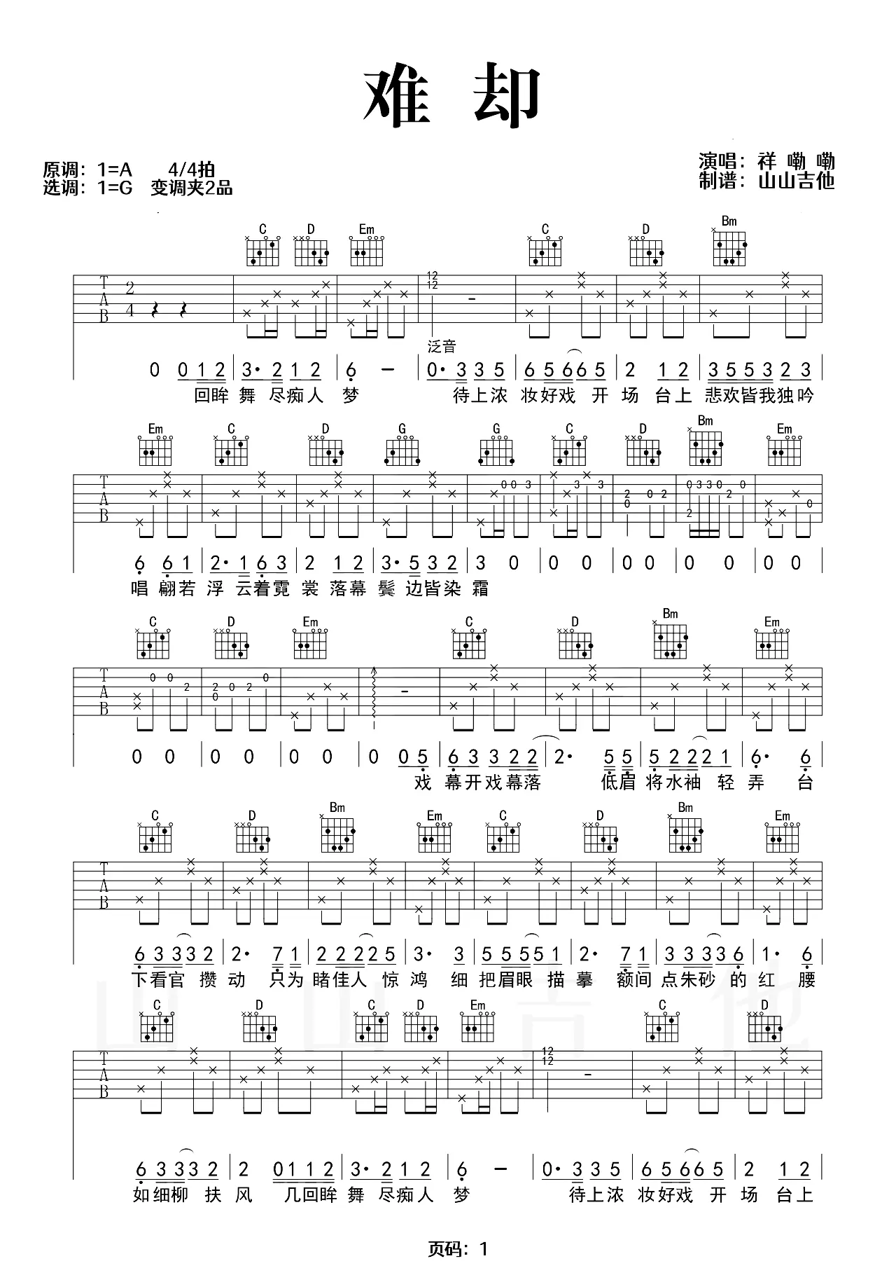 祥嘞嘞《难却》吉他谱,原唱为平生不晚,祥嘞嘞翻唱的一首古风歌曲,由Cyan作词,小风铃作曲,收录于2022年发行的专辑《难却 (吉他版)》中。歌曲原调A,吉他谱选用G调指法编配,capo夹2品,共2张图片谱。