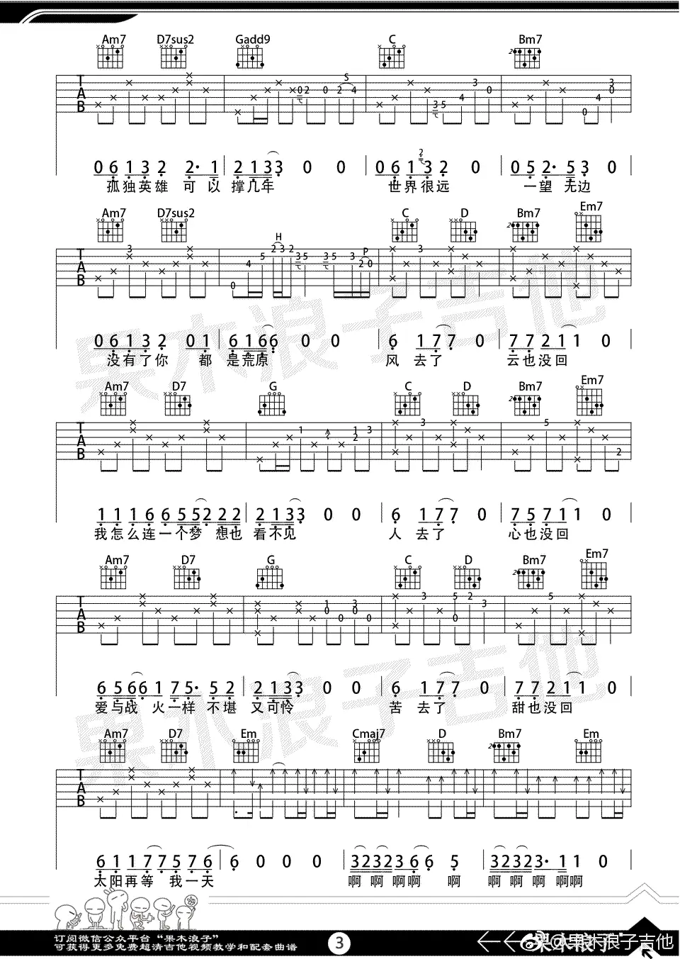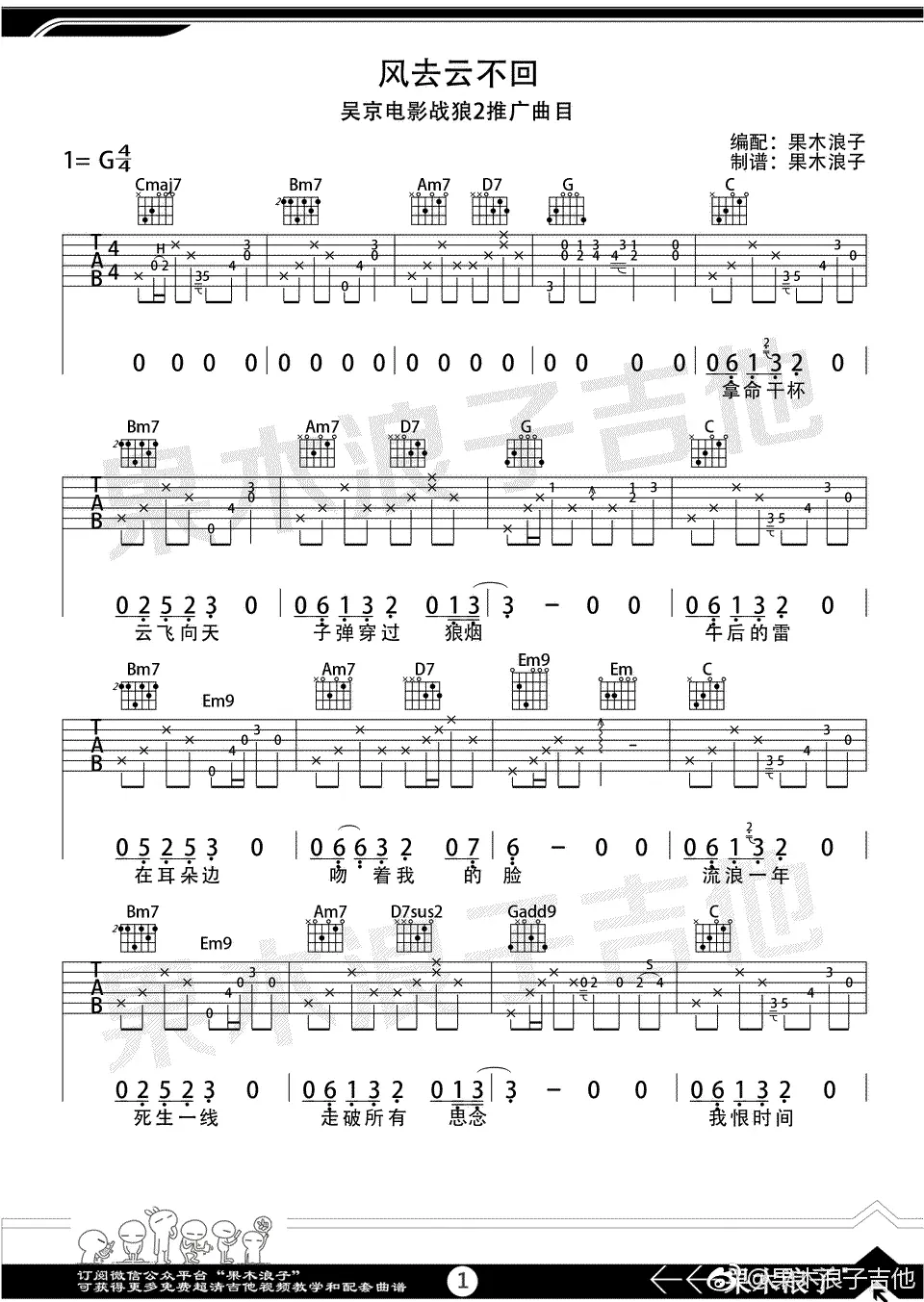 风去云不回吉他谱,吴京演唱的一首歌,由易家扬作词,颜子作曲,2017年发行,收录于2017年发行的专辑《战狼2》原声带中,同时是电影《战狼2》的宣传曲。 吉他谱选用G调指法编配,共4张高清图片谱,由果木浪子编配制谱出品。