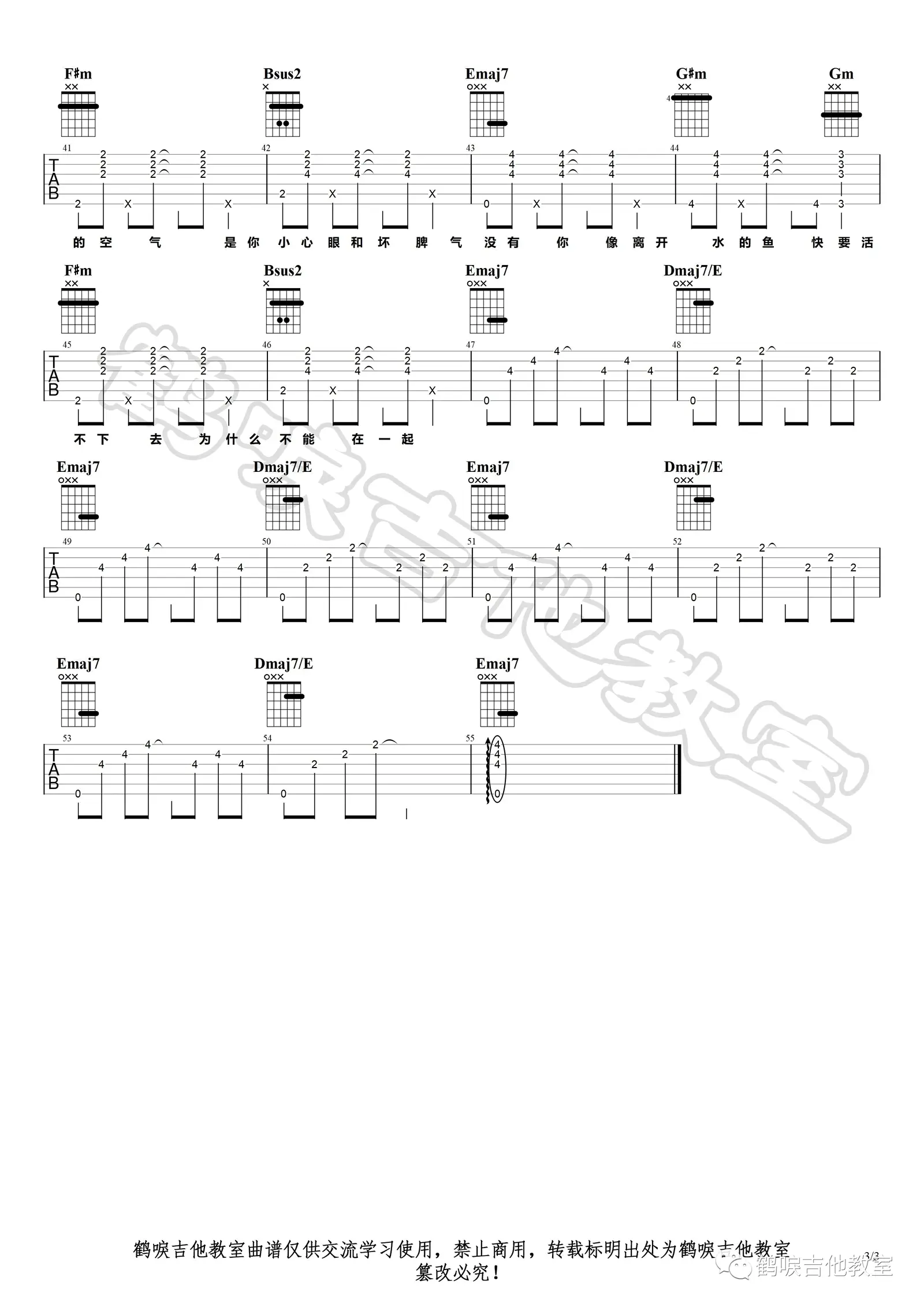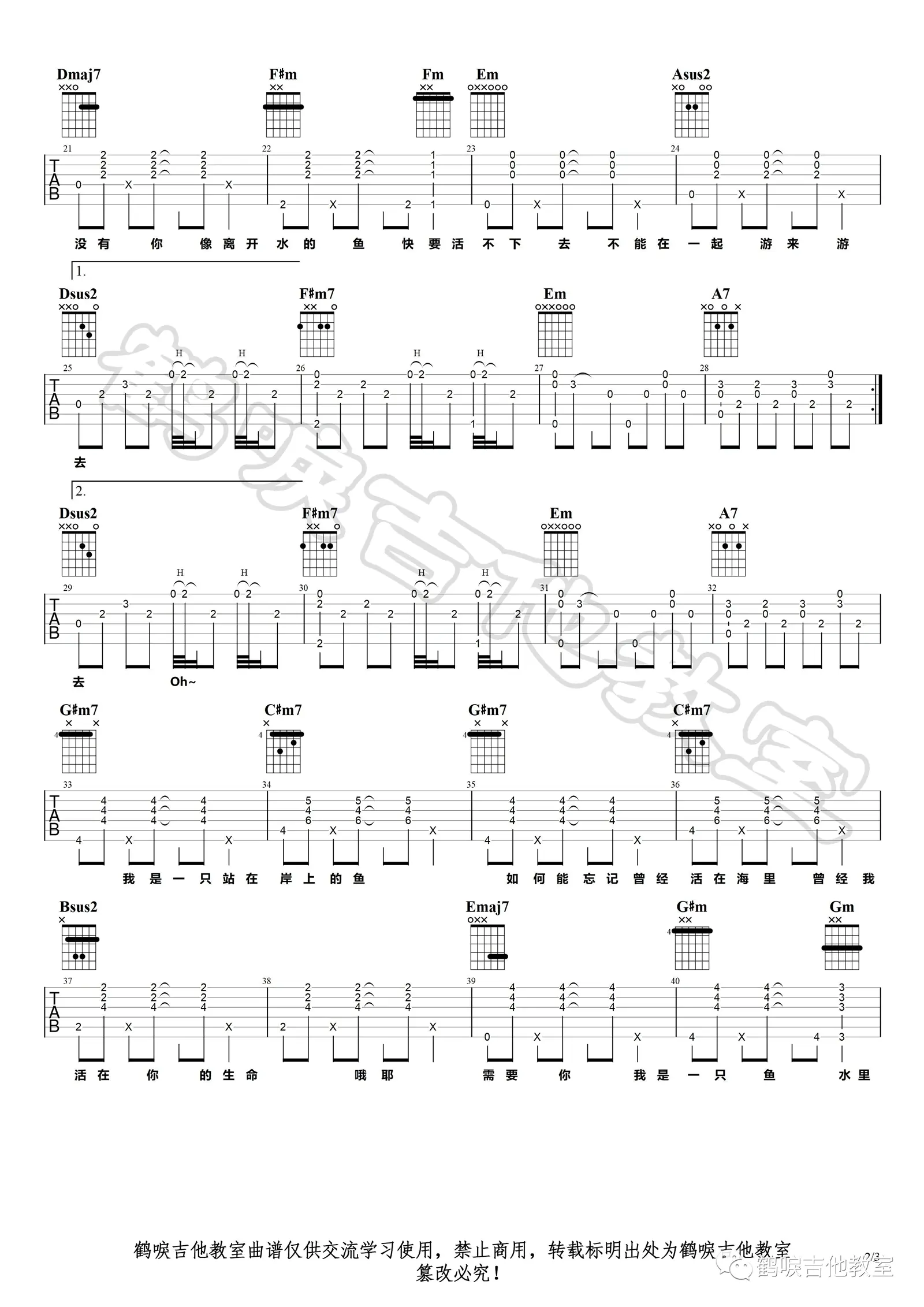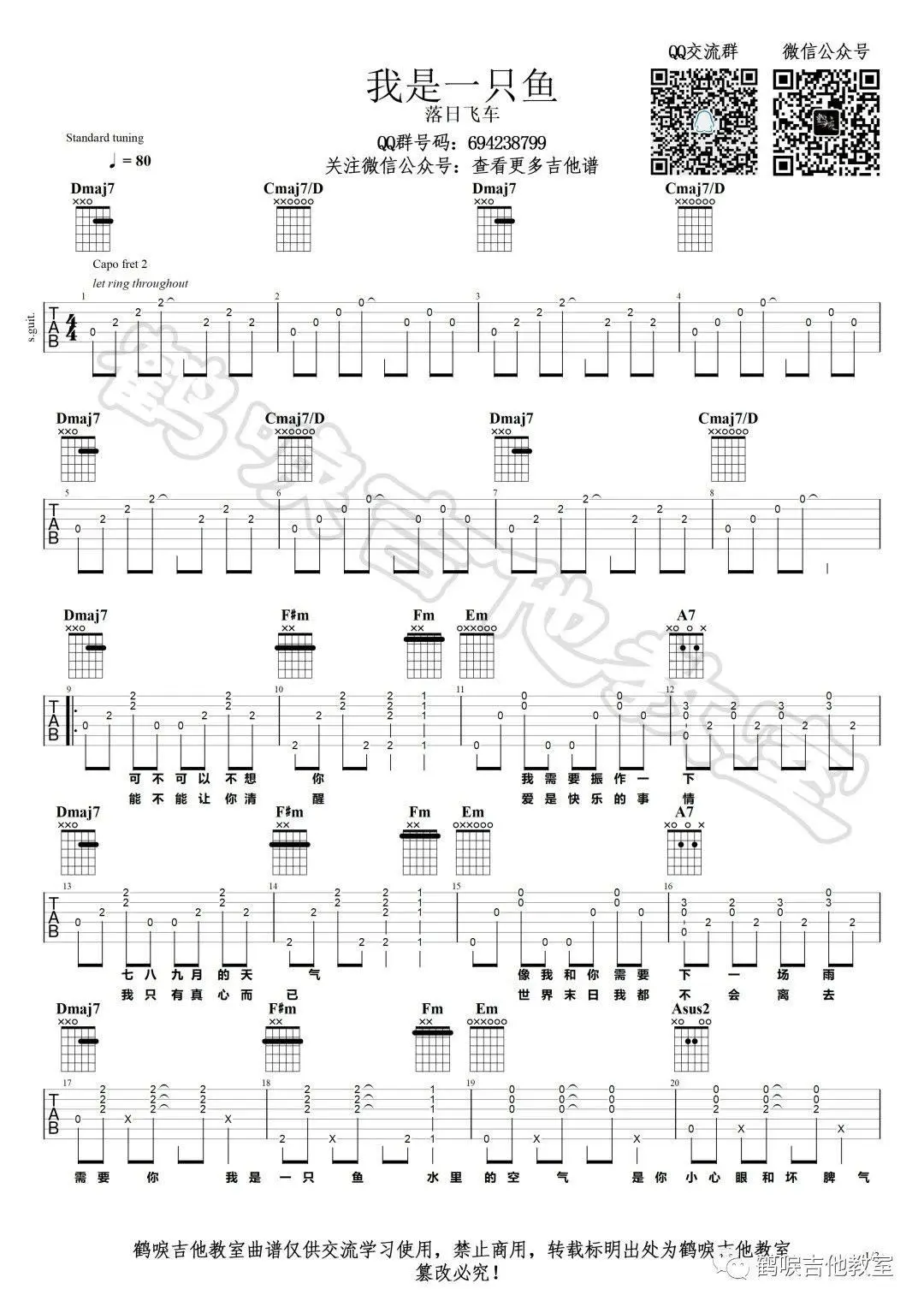 《我是一只鱼》吉他谱,落日飞车翻唱任贤齐的经典歌曲,由刘思铭作词,刘志宏作曲,收录于2019年发行的专辑《我是一只鱼》中,改编自任贤齐原唱,CityPop风格。 capo夹2品,共3张图片谱,由鹤鸣吉他教室编配出品。
