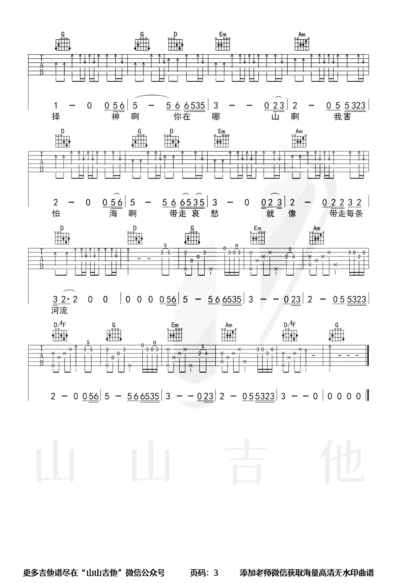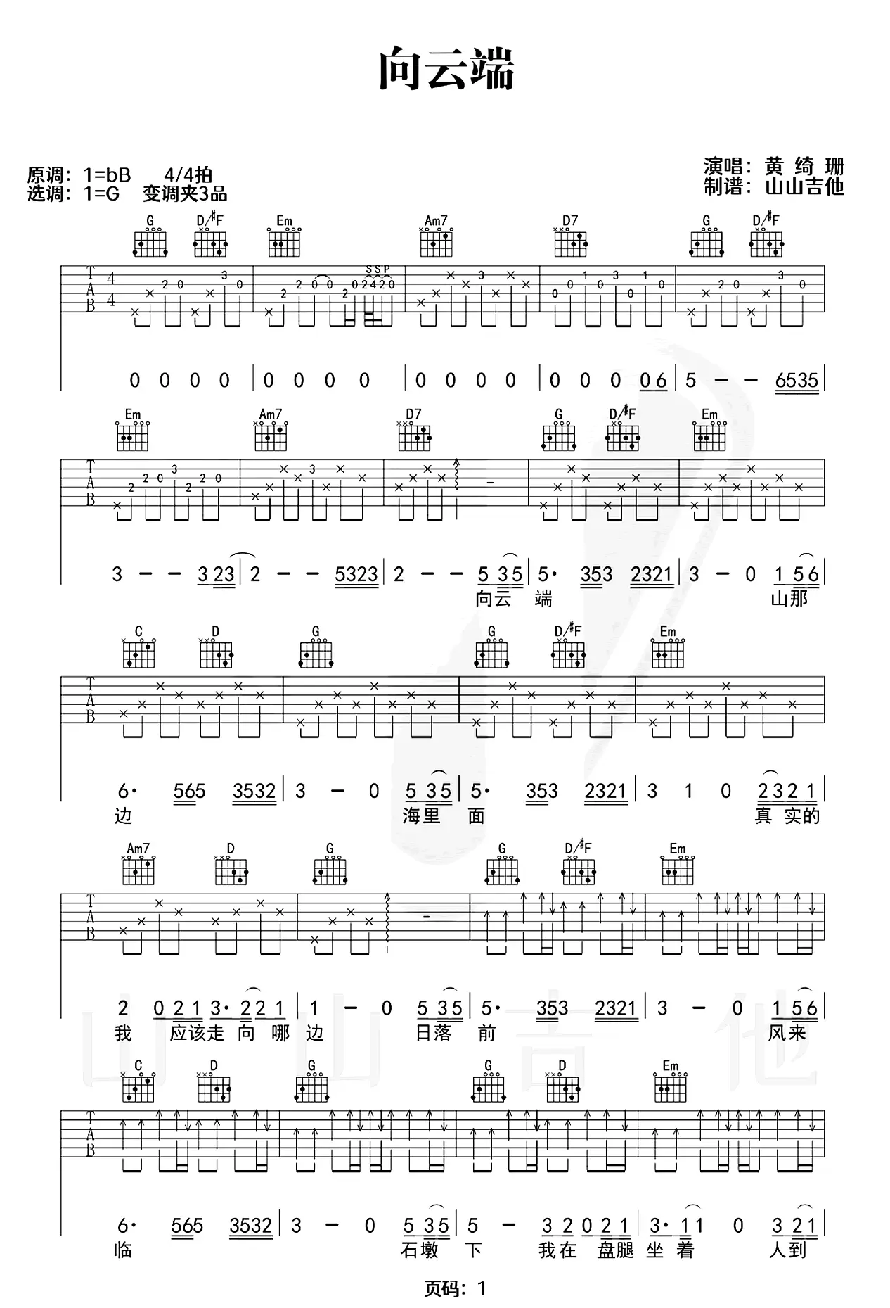 向云端吉他谱,黄绮珊演唱的一首歌曲,由海洋Bo作词作曲,2023年发行,收录于专辑《向云端》中。 歌曲原调降B,吉他谱选用G调指法编配,变调夹夹3品为原调,共3张图片谱,由山山吉他编配出品。