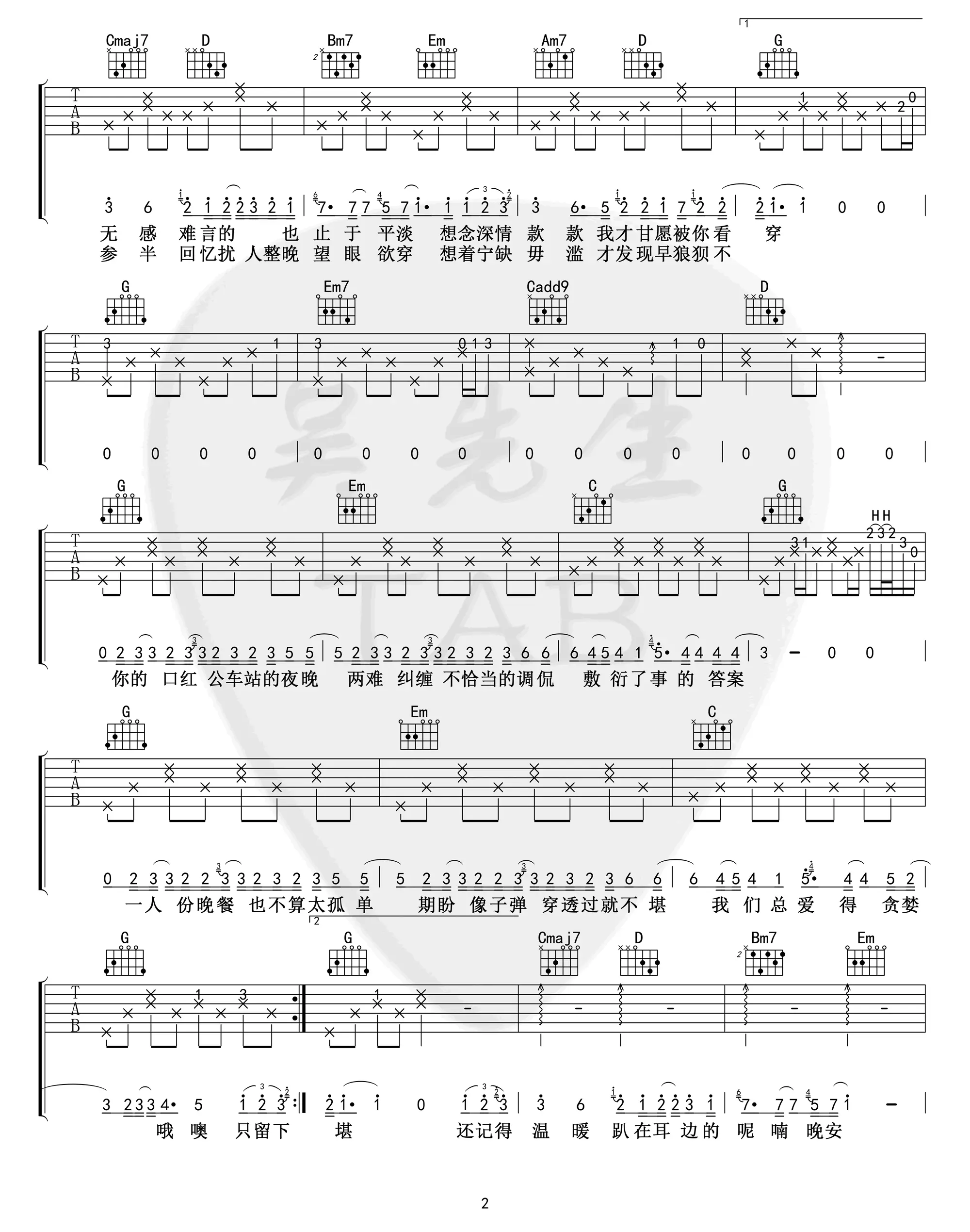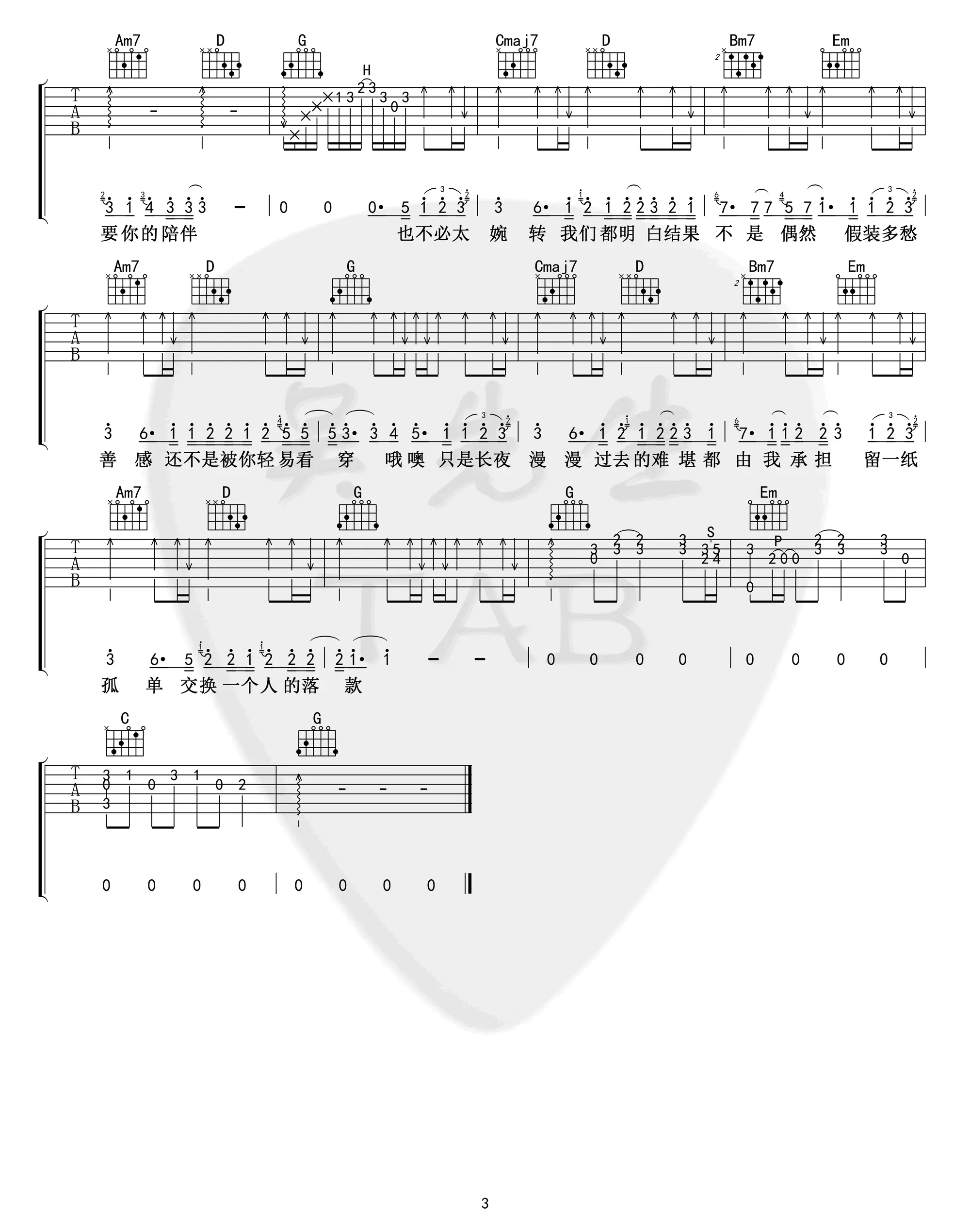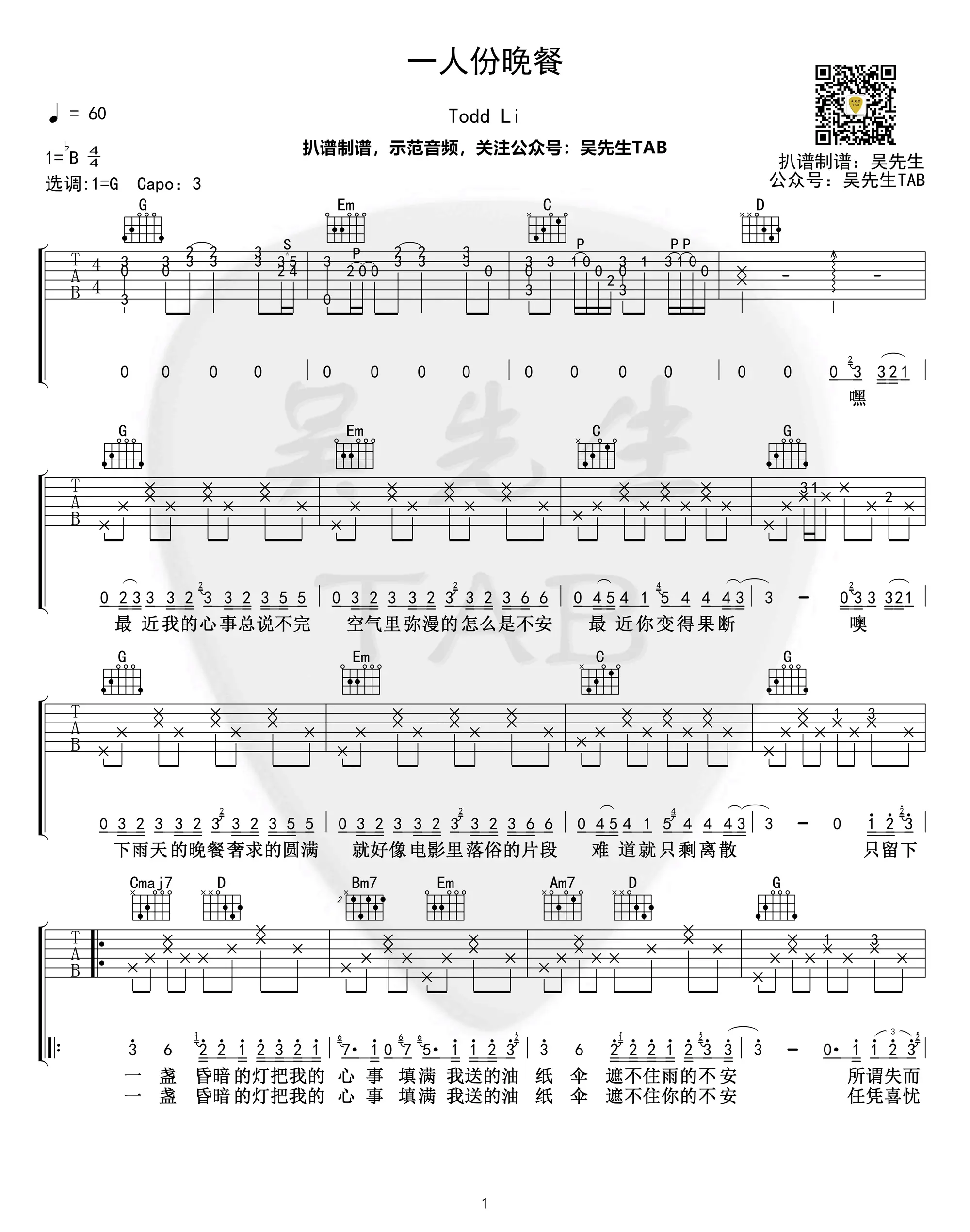 《一人份晚餐》吉他谱,桃德李Todd Li与Lacklustrr共同演唱的一首歌曲,由桃德李Todd Li作词,Lacklustrr作曲,2019年发行,收录于专辑《一人份晚餐》中。歌曲原调bB,吉他谱选调G,变调夹夹3品,由吴先生编配出品。只是长夜漫漫,过去的难堪都由我承担,留一纸孤单,交换一个人的落款。