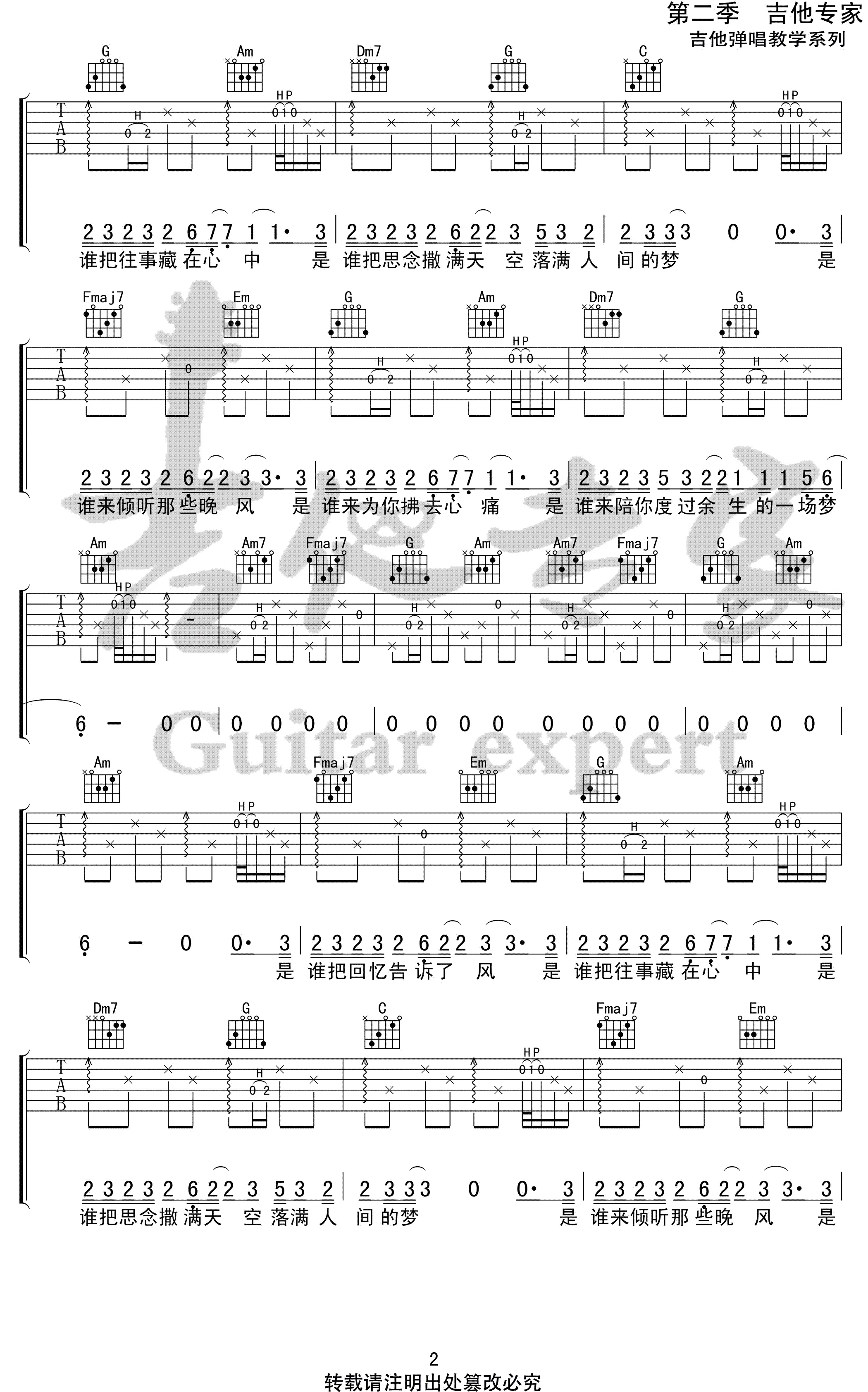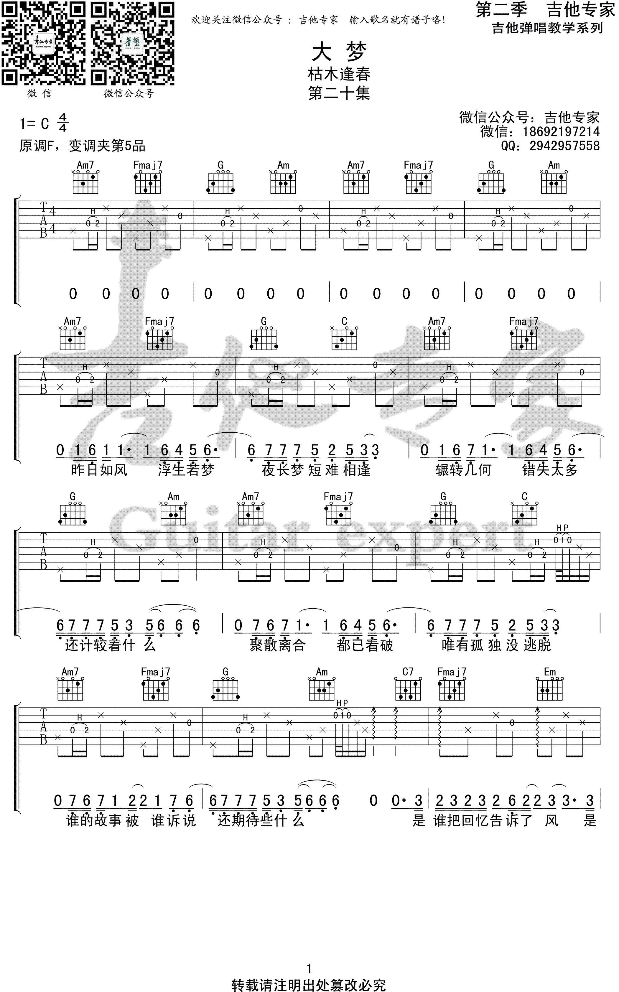 《大梦》吉他谱,枯木逢春演唱的一首歌曲,由他本人创作词曲,收录于专辑《亦是此间少年》中。歌曲原调F,吉他谱选调C,capo夹5品,共3张高清图片谱,由吉他专家编配出品。是谁把回忆告诉了风,是谁把往事藏在心中,是谁把思念撒满天空,落满人间的梦。