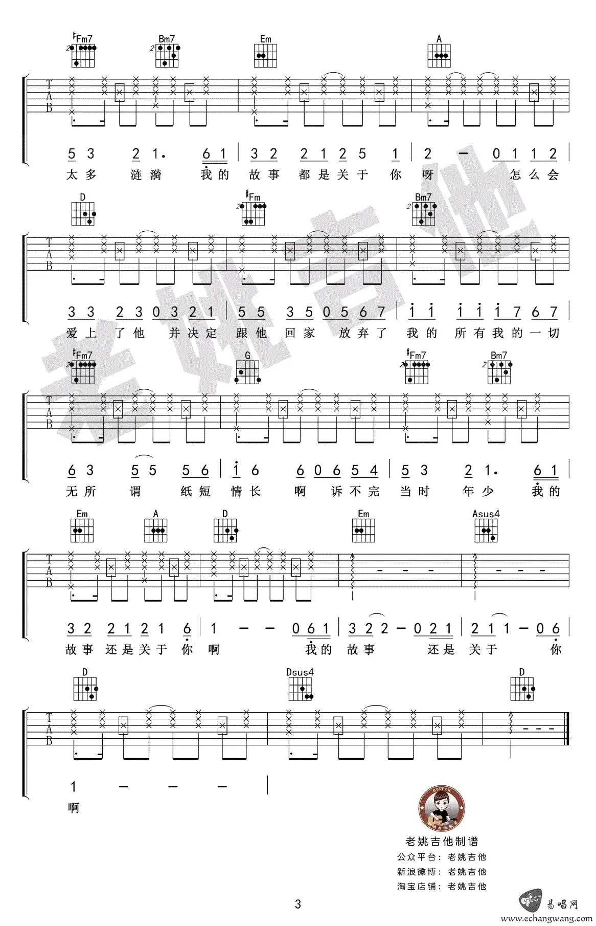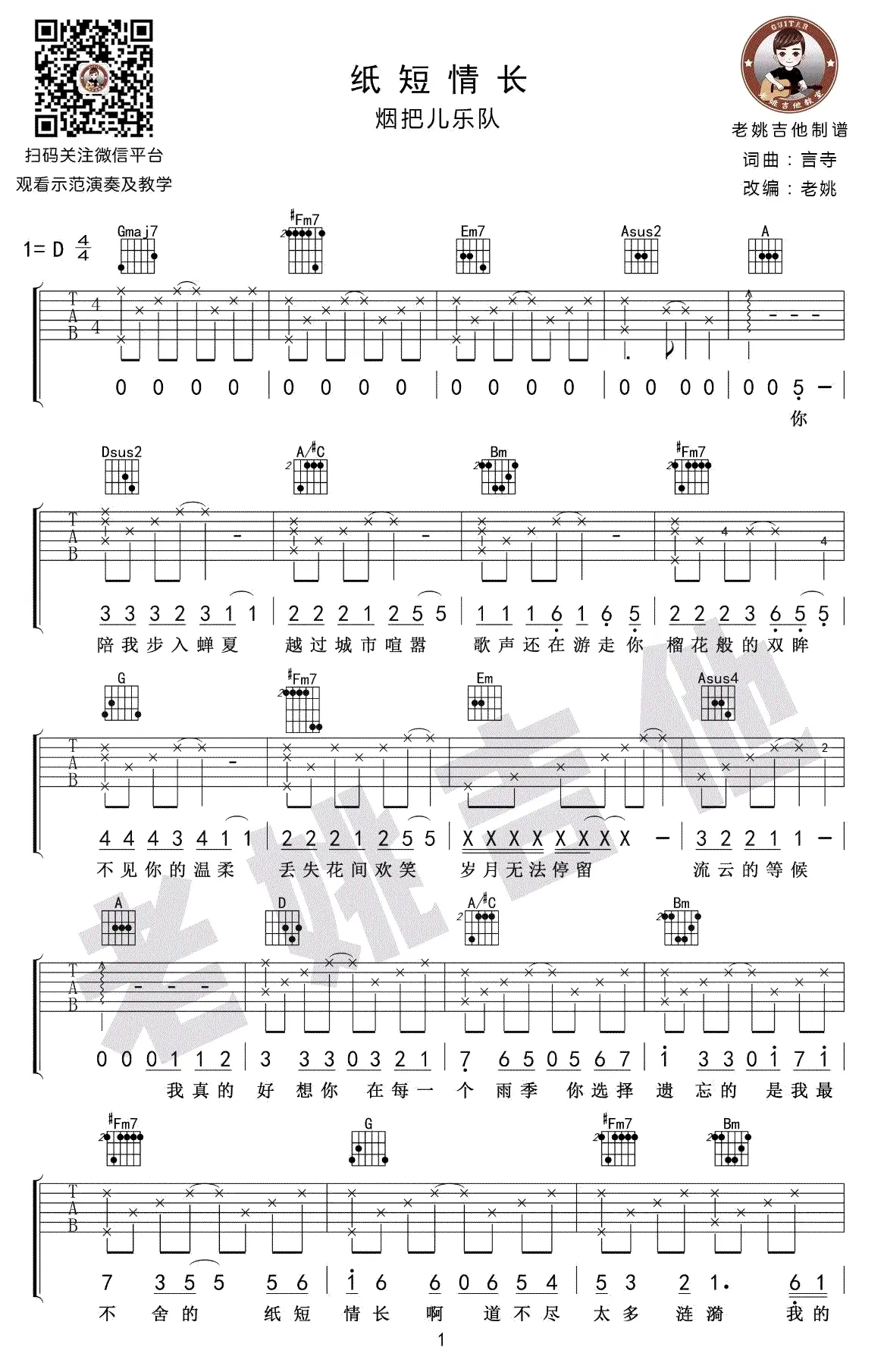 《纸短情长》吉他谱,烟把儿乐队演唱歌曲,由言寺作词作曲,2017年发行,收录于单曲专辑《纸短情长》中。吉他谱选用D调指法编配,由老姚吉他编配出品。