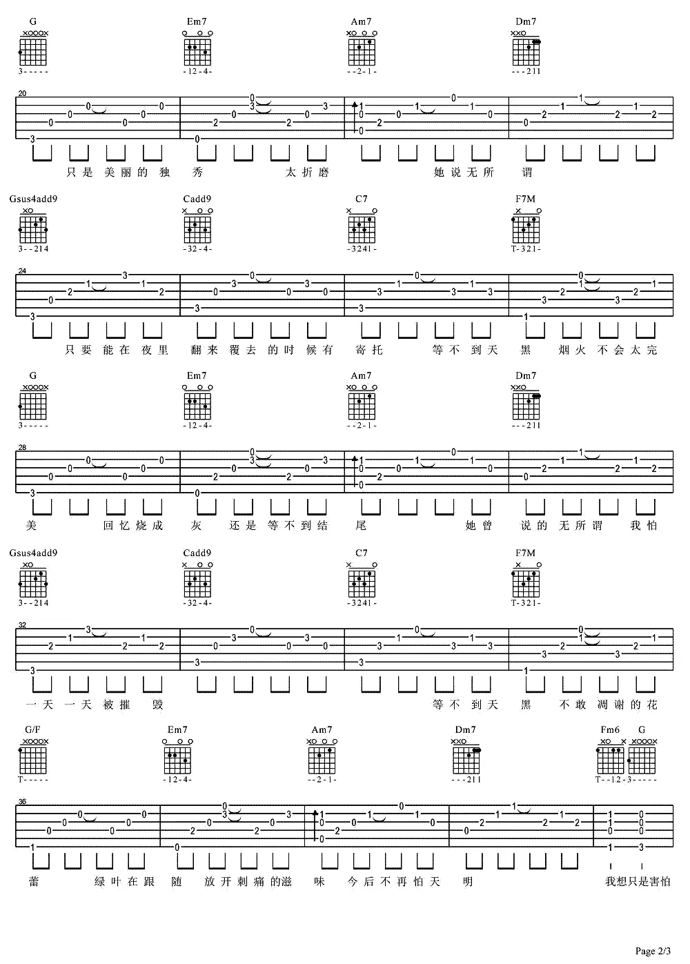 《她说》吉他谱,张碧晨翻唱的一首歌,由孙燕姿、易家扬作词,林俊杰作曲,2014年发行,收录于专辑《中国好声音第三季 第2期》中。 变调夹夹3品,共3张图片谱,由蔡宁编配出品。