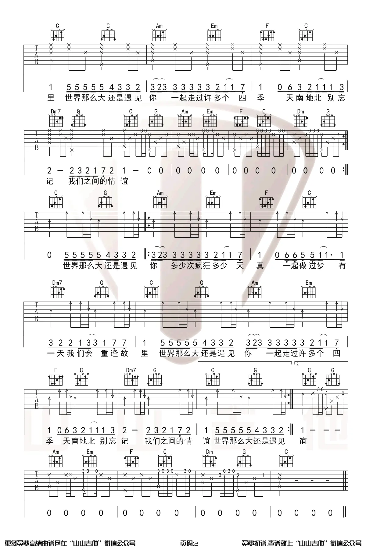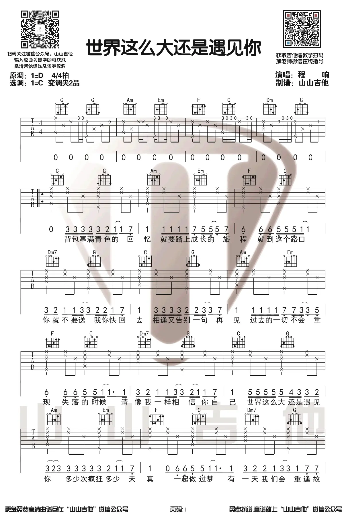 《世界这么大还是遇见你》吉他谱,程响演唱,由程响作词,Htet Aung Lwin作曲,收录在2020年发行的专辑《清新的小女孩 (中文版)》中,改编自缅甸歌曲《清新的小女孩 (For Ma)》。 歌曲原调D,吉他谱选调C,capo夹2品,由山山吉他编配出品。