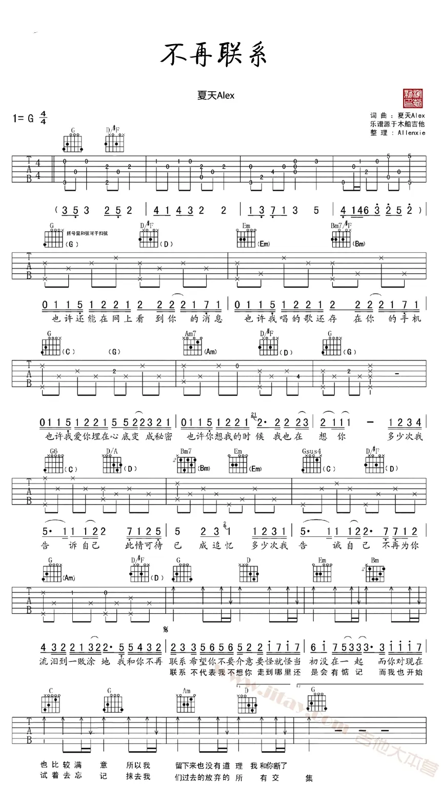 《不再联系》吉他谱_夏天Alex_G调_弹唱图片谱_六线谱