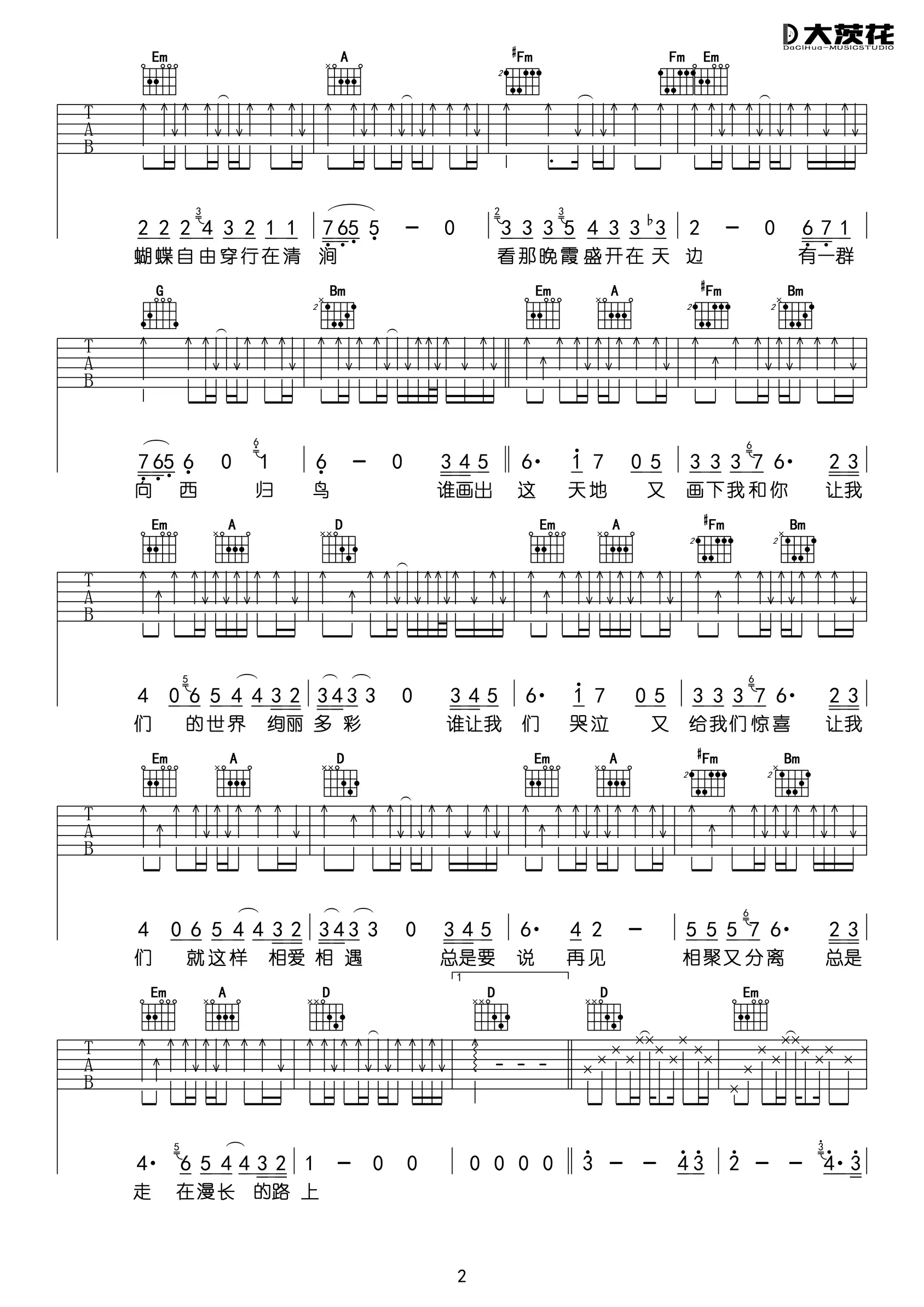《旅行》吉他谱,许巍作词、作曲并演唱,收录于2004年发行的专辑《每一刻都是崭新的》中,该歌曲是电影《后会无期》的插曲。 吉他谱选用D调指法编配。 阵阵晚风吹动着松涛 吹响这风铃声如天籁 站在这城市的寂静处 让一切喧嚣走远 只有青山藏在白云间 蝴蝶自由穿行在清涧 看那晚霞盛开在天边 有一群向西归鸟