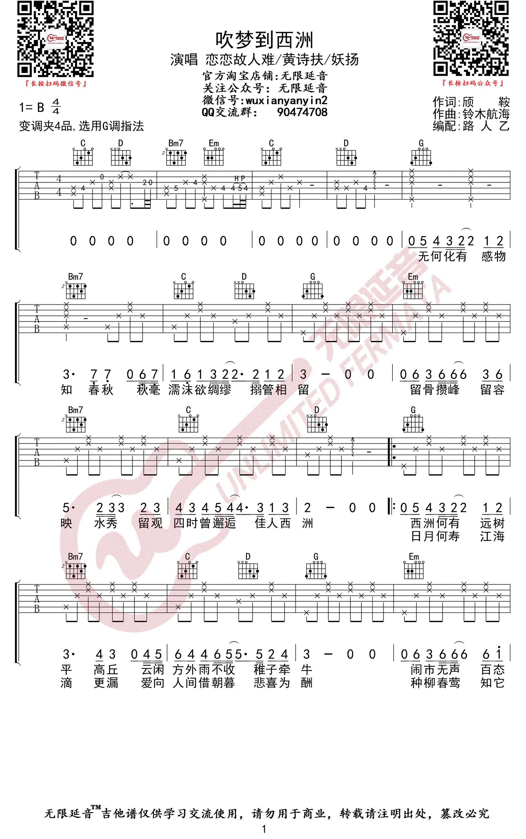 《吹梦到西洲》吉他谱,黄诗扶和妖扬演唱的一首奇幻曼丽古风歌曲,由颀鞍作词,铃木航海作曲,2019年发行,收录在专辑《吹梦到西洲》中。 歌曲原调B,吉他谱选调G,capo夹4品为原调,共3张高清图片谱,由无限延音编配出品。
