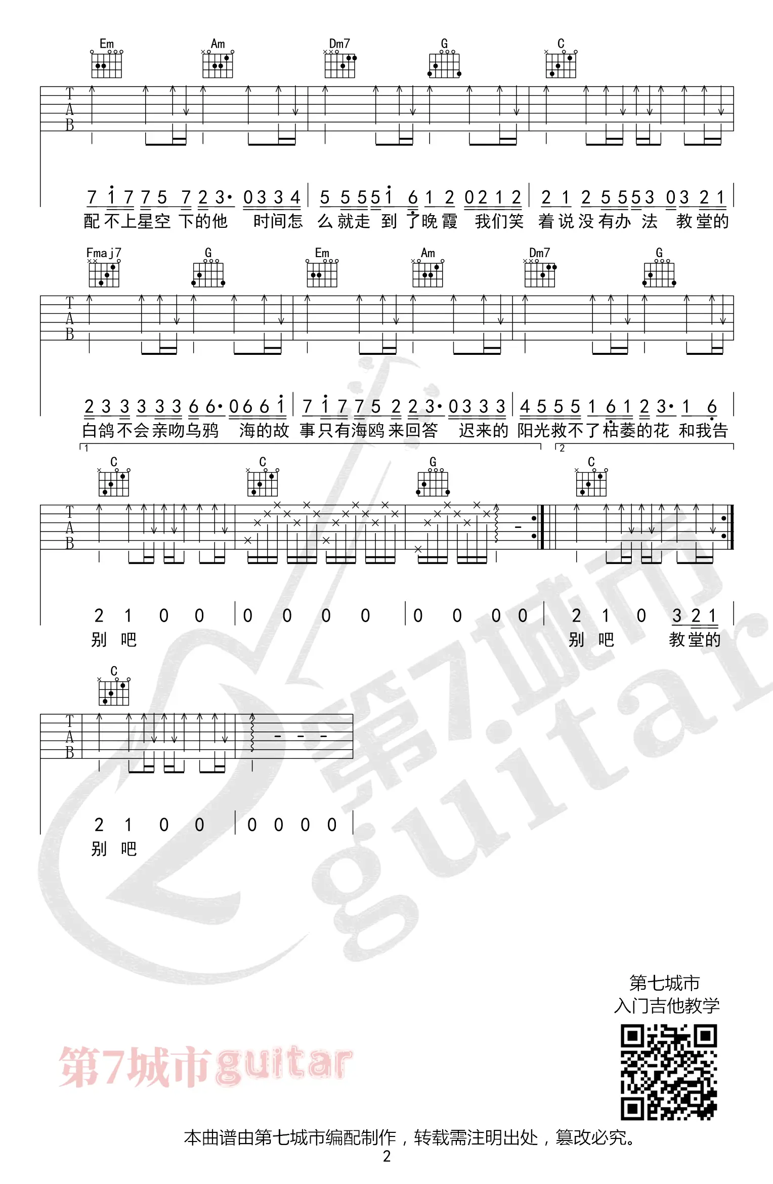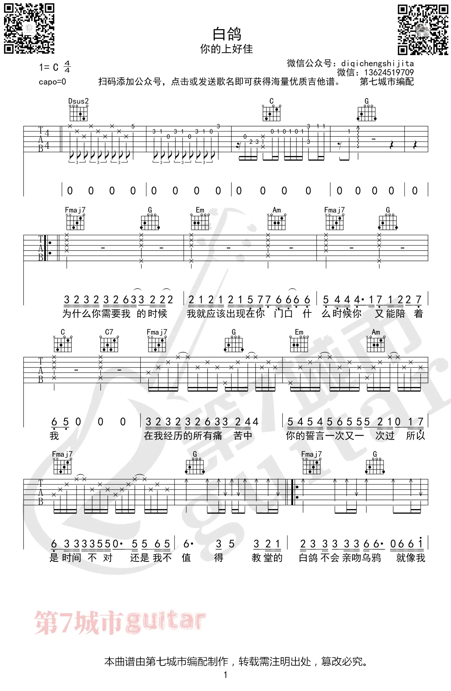 《白鸽》吉他谱_你的上好佳_C调_高清弹唱谱_图片谱