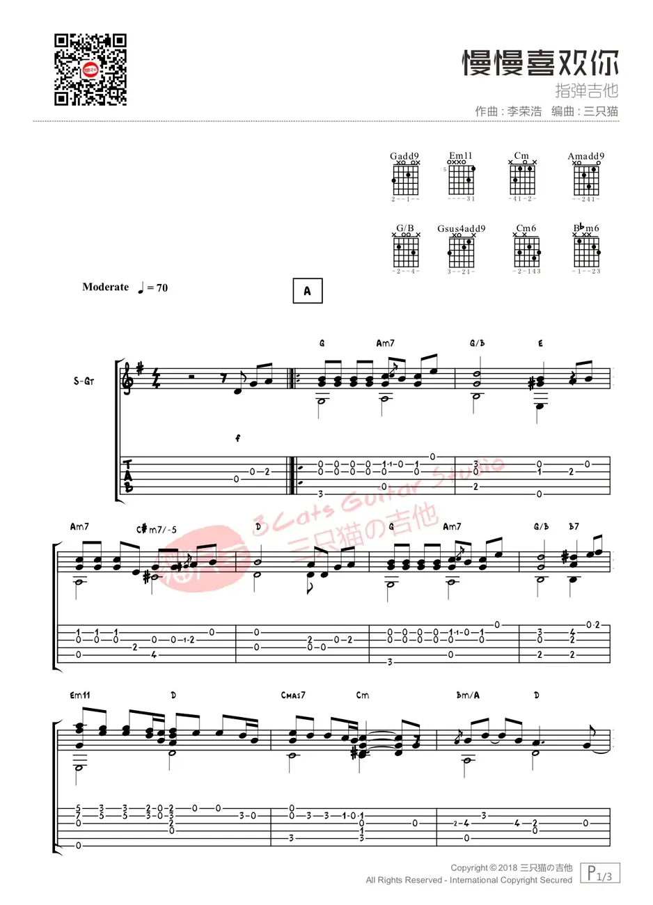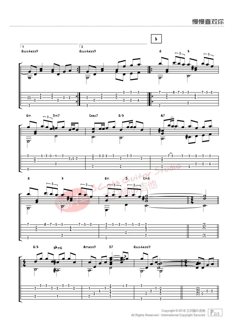 《慢慢喜欢你》指弹谱,莫文蔚演唱的一首情歌,由李荣浩作词作曲,2018年发行,收录于专辑《我们在中场相遇》中。吉他独奏谱共3张图片谱,由三只猫吉他编配出品。