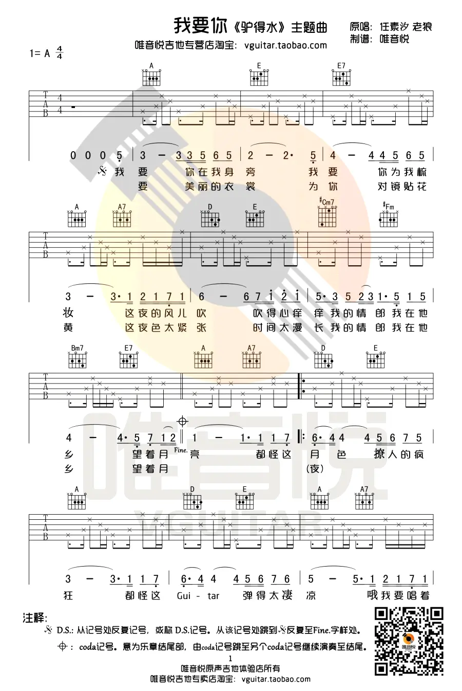 《我要你》吉他谱,任素汐原唱,老狼重新演绎,樊冲作词作曲,2016年发行,收录于任素汐专辑《我要你》中,电影《驴得水》主题曲。吉他谱选用A调指法编配,演奏难度简单。