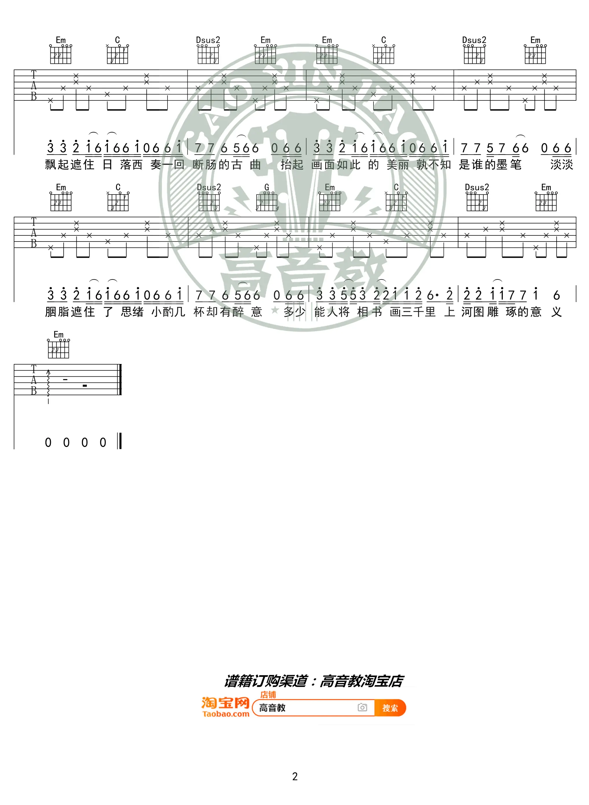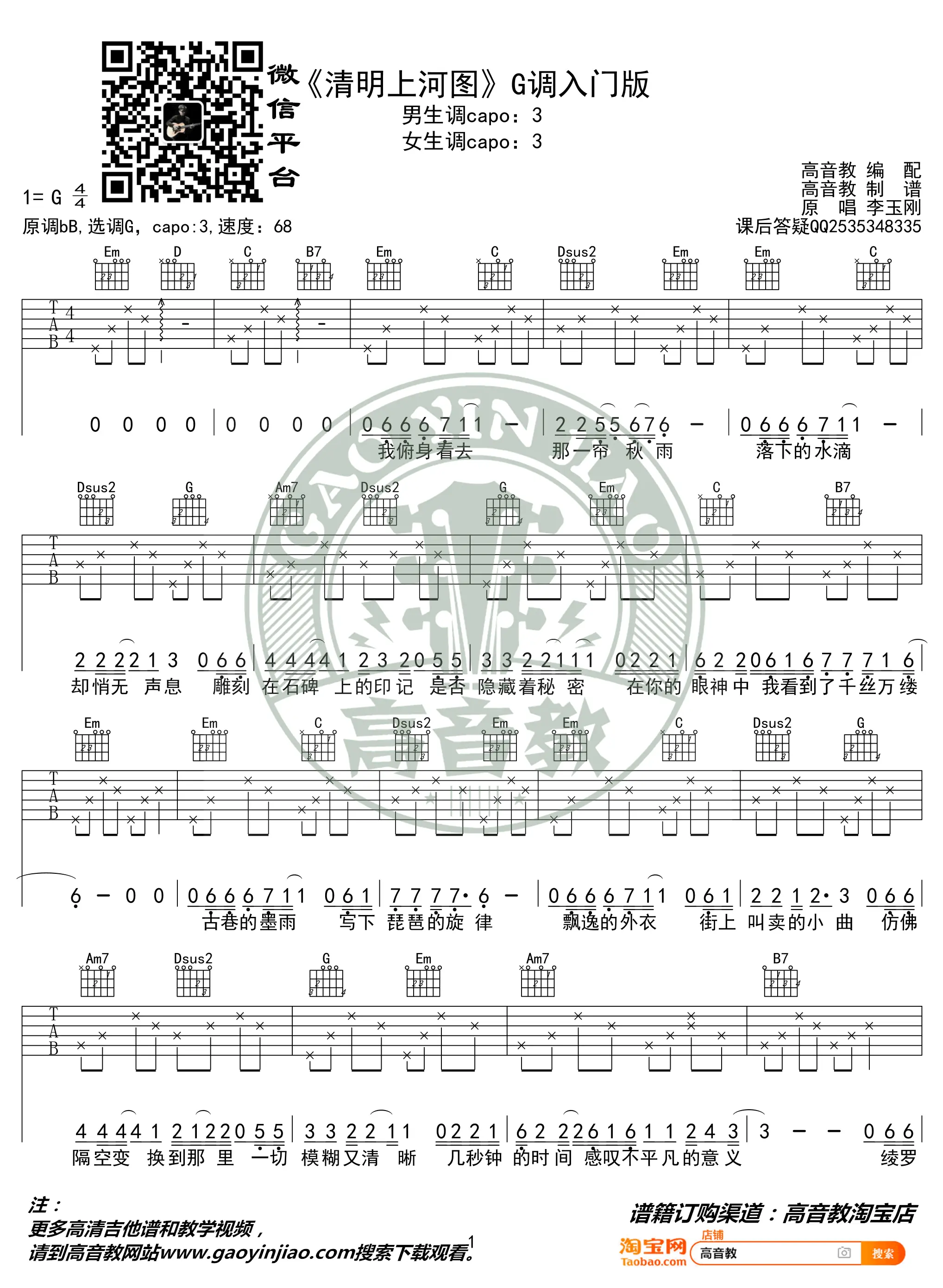 《清明上河图》吉他谱,李玉刚演唱的一首古风歌曲,由高进作词作曲,2010年发行,收录于专辑《新贵妃醉酒》中,融合传统戏曲与流行音乐元素。歌曲原调B,吉他谱选用G调指法编配,capo夹3品,演奏难度简单,由高音教编配出品。