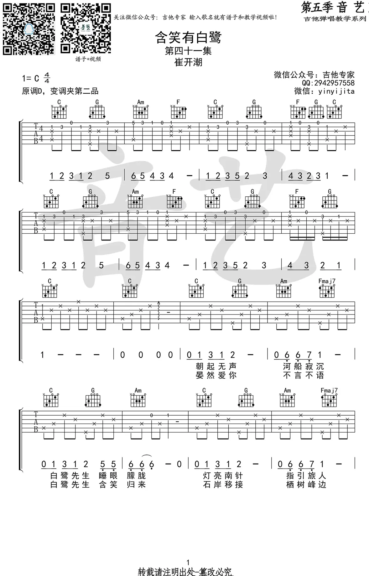 《含笑有白鹭》吉他谱_崔开潮_C调弹唱谱_完整版六线谱_图片谱