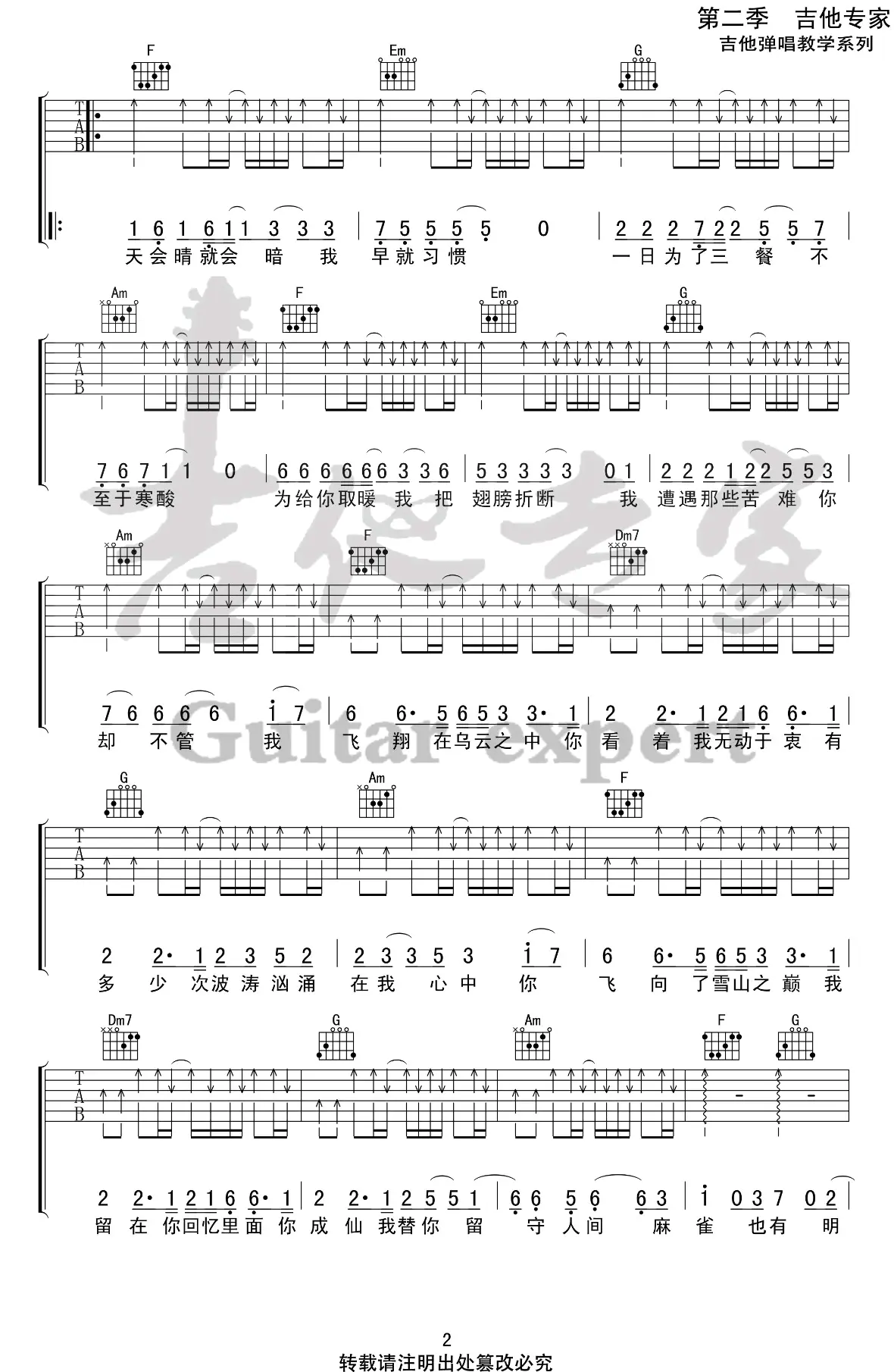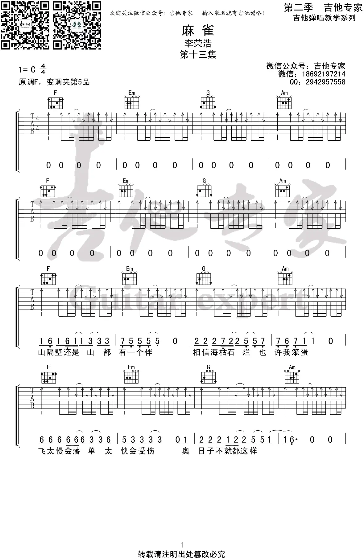 《麻雀》吉他谱,李荣浩创作及演唱的一首歌,2019年发行单曲,收录于2020年发行的专辑《麻雀》中。歌曲原调F,吉他谱选用C调指法编配,capo夹5品,共3张图片谱,由吉他专家制谱出品。