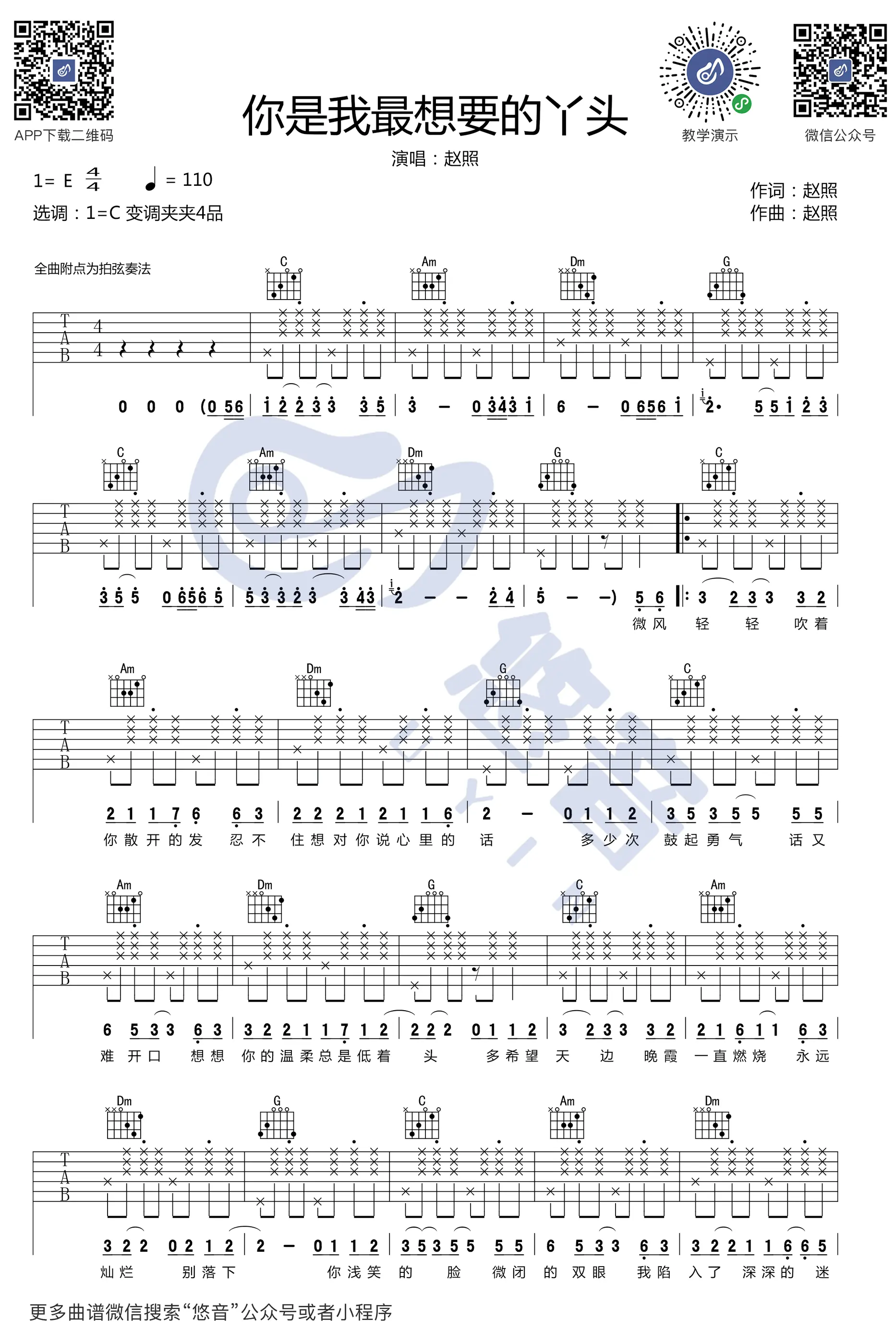 《你就是我最想要的丫头》吉他谱,赵照作词作曲及演唱的原创民谣,收录于2008年发行的同名EP《你就是我最想要的丫头》中,该曲同时为电视剧《嘿!老头》插曲。歌曲原调E,吉他谱选用C调指法编配,capo夹4品为原调,全曲采用附点拍弦奏法。共3张高清图片谱,由悠音吉他编配出品。