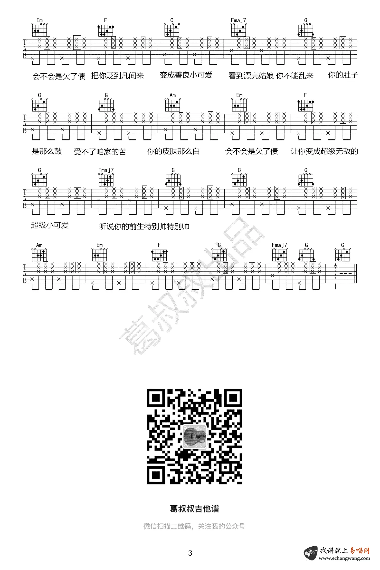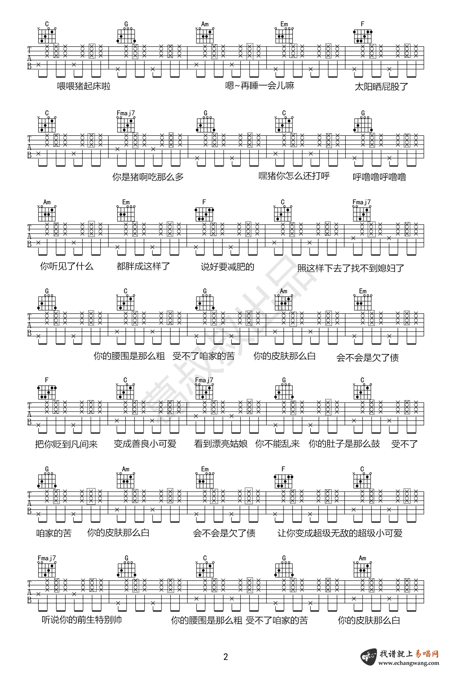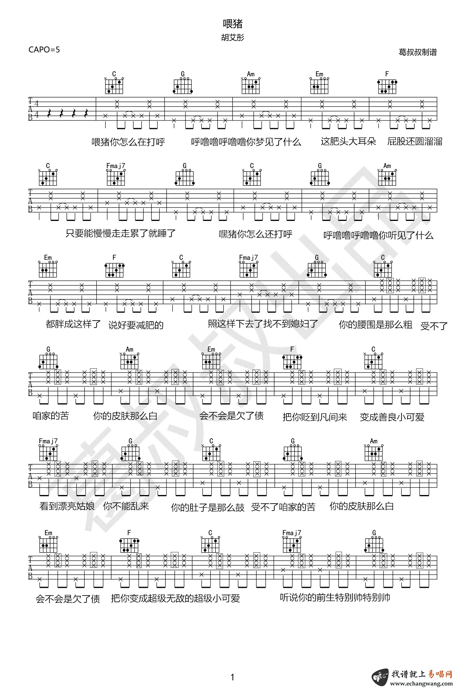《喂猪》吉他谱_胡艾彤_C调_弹唱谱_图片谱_网络热门