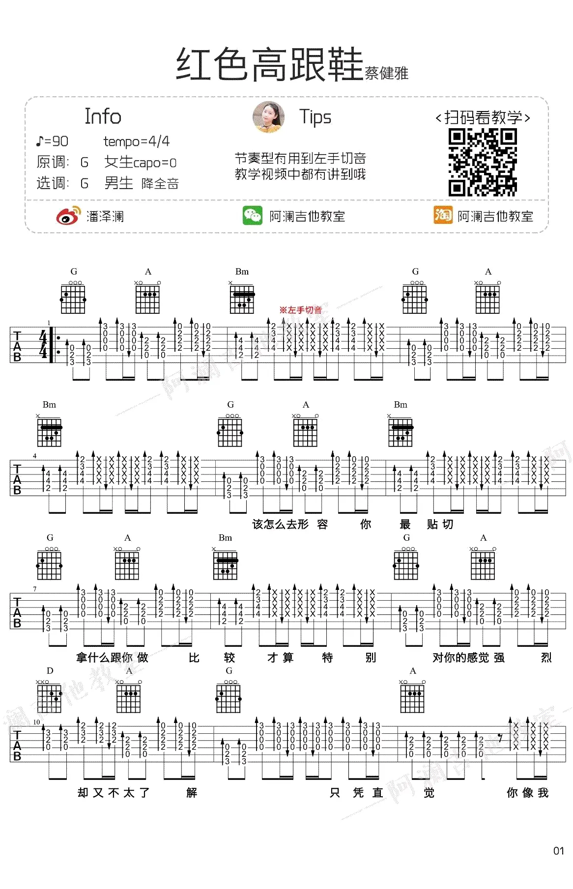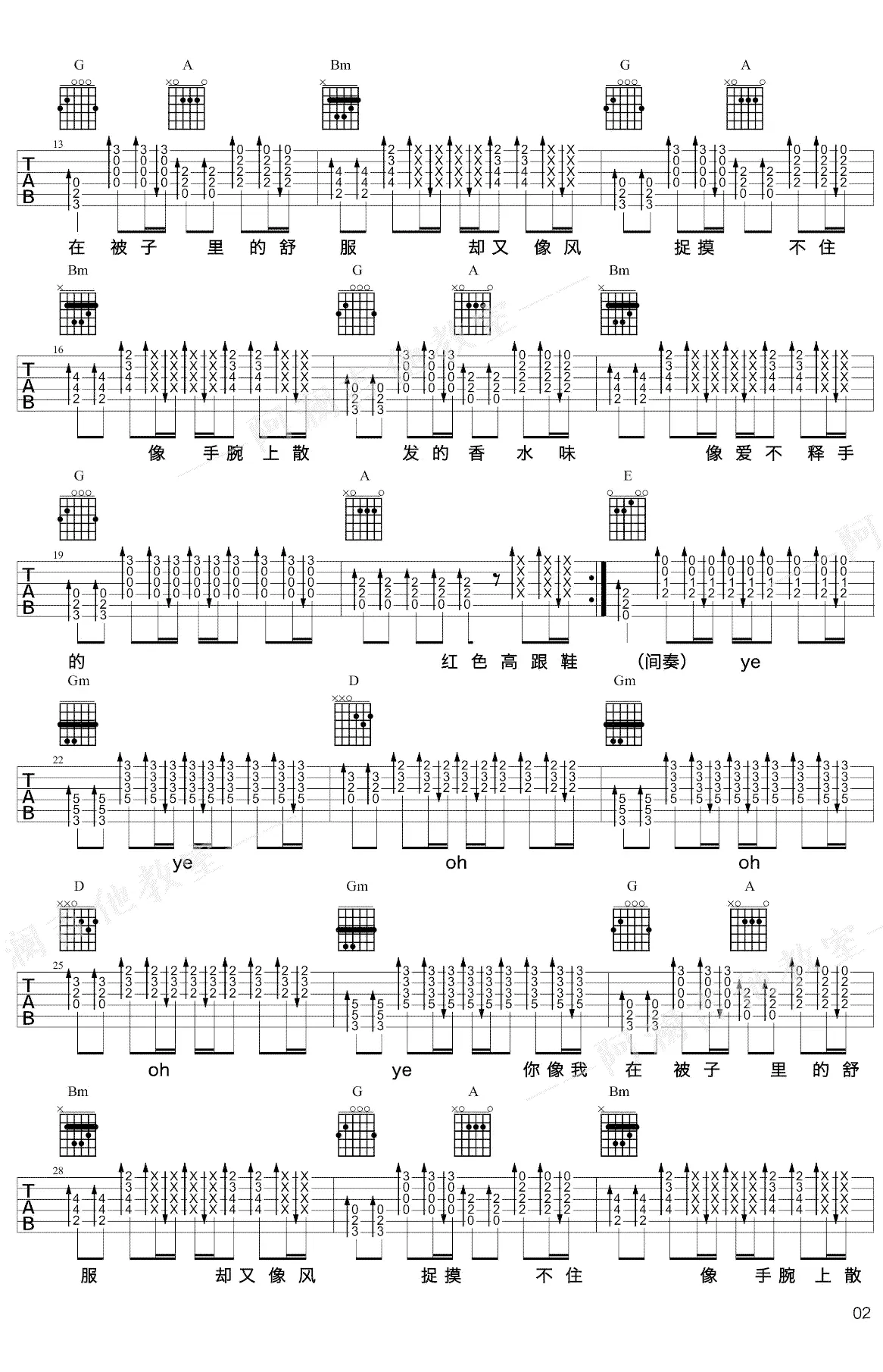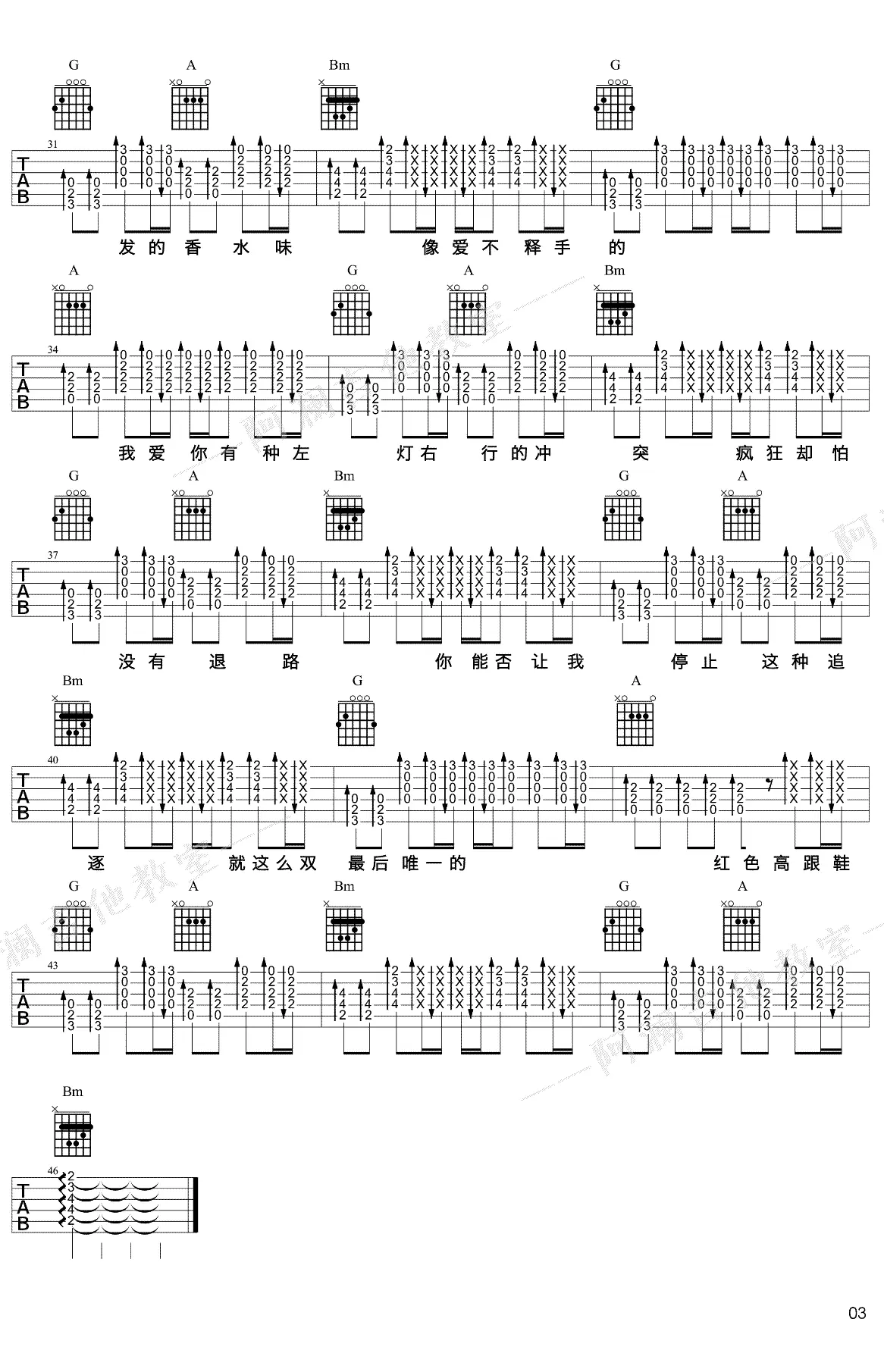 《红色高跟鞋》吉他谱,蔡健雅创作及演唱的一首歌曲,由蔡健雅作词作曲,2008年11月发行,作为电影《爱情呼叫转移Ⅱ:爱情左右》主题曲,收录于2009年发行的专辑《若你碰到他》中。吉他谱选用G调指法编配,共3张图片谱,由阿澜编配出品。