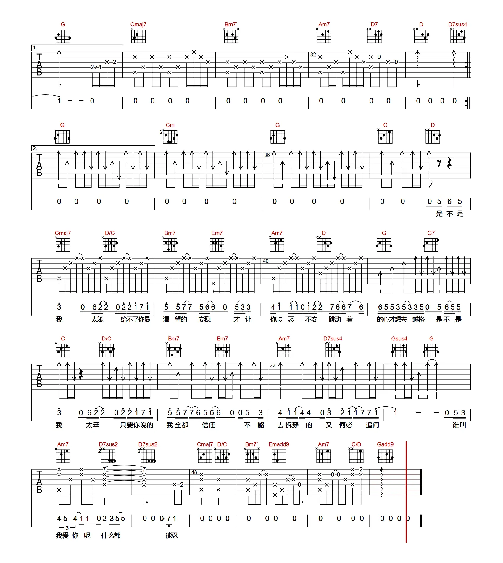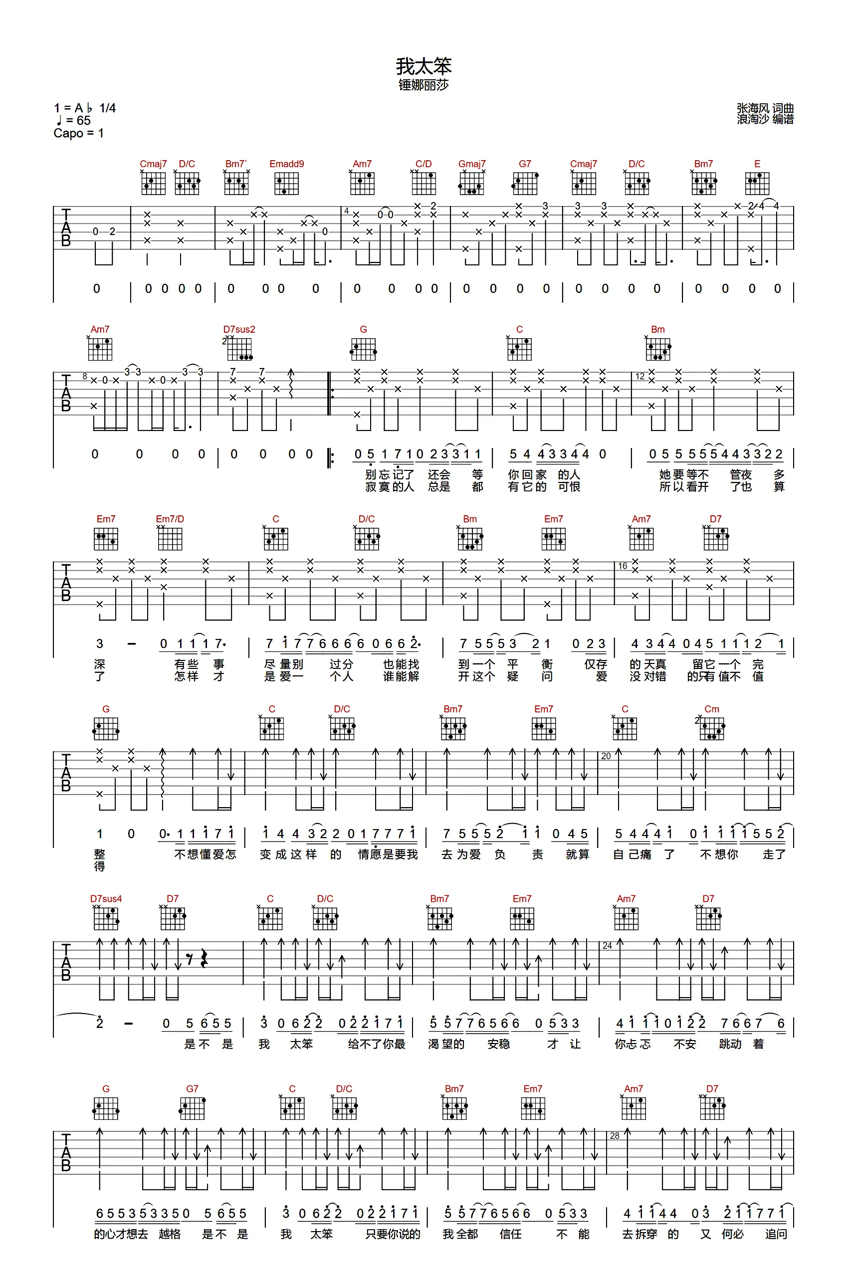 《我太笨》吉他谱,锤娜丽莎演唱的一首网络伤感情歌,由张海风作词作曲,收录于2021年发行的同名专辑《我太笨》中。歌曲原调降A,吉他谱选用G调指法编配,capo夹1品为原调,完整版共2张高清图片谱。