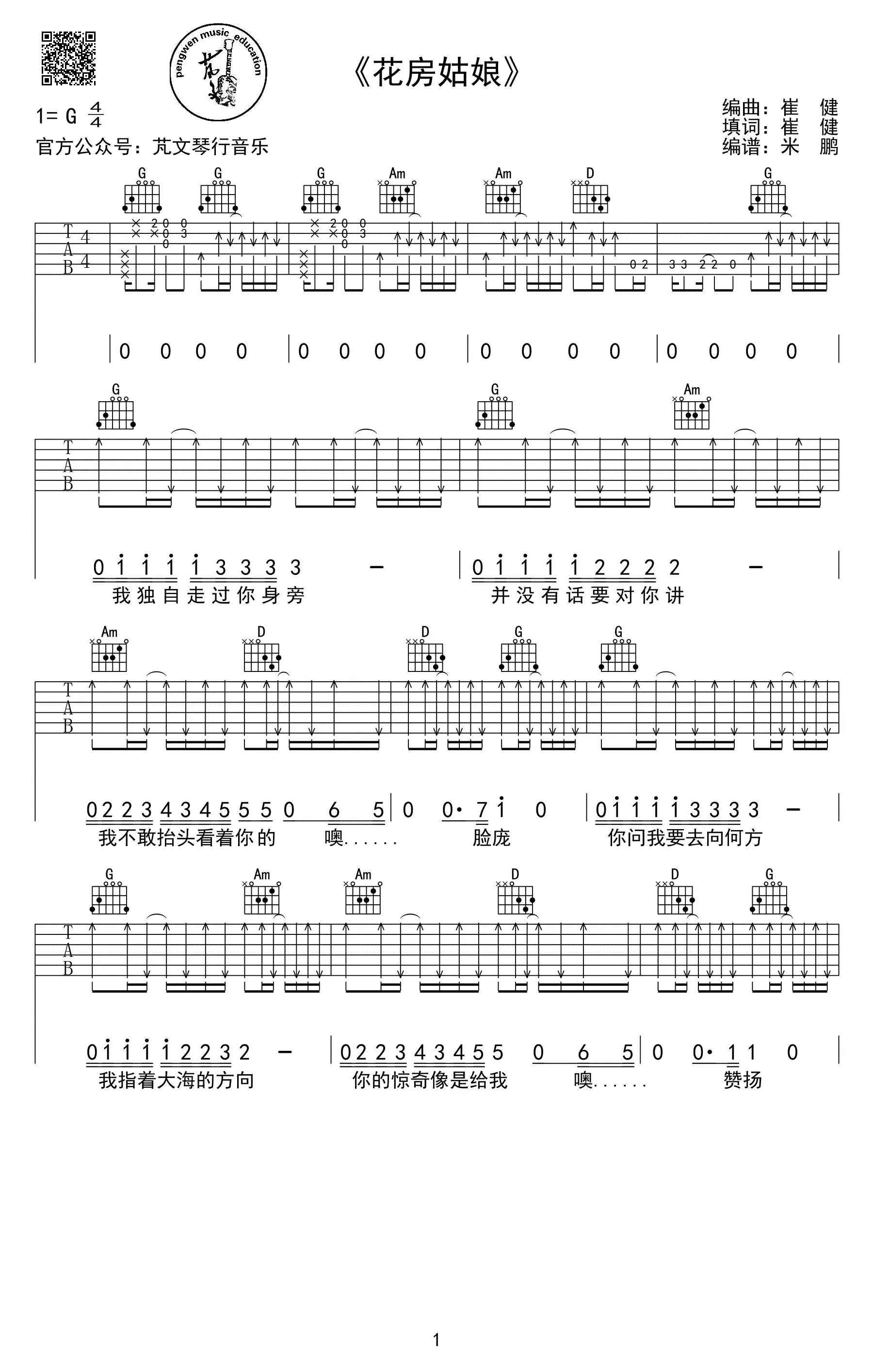 《花房姑娘》吉他谱,崔健创作及演唱的一首歌曲,收录于1989年发行的专辑《新长征路上的摇滚》中。吉他谱选用G调指法编配,共3张高清图片谱,由芃文音乐编配出品。